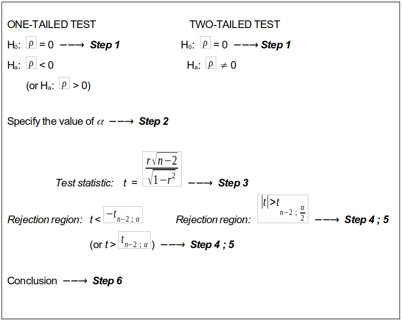 The previous hypothesis tests were performed to statistically determine whether a linear relationship or regression exists between the variables. In this section we will discuss another hypothesis test which is about determining whether a correlation between the variables exists. Keep in mind that the correlation coefficient r measures the correlation (strength) between x-values and y-values for the sample data. But, a similar coefficient of correlation exists for the whole population of data from which the sample was selected. So, we want to know whether there is any evidence of a statistically significant correlation between the x-values and the y-values of the population of data. By now you know that, if we want more information about the population of data, we have to perform a hypothesis test. If r denotes the correlation for the sample data, what symbol are we going to use to denote the population correlation coefficient? The population correlation coefficient is denoted by the symbol \((\rho)\). The procedure to test for correlation between two variables is outlined in the figure below.