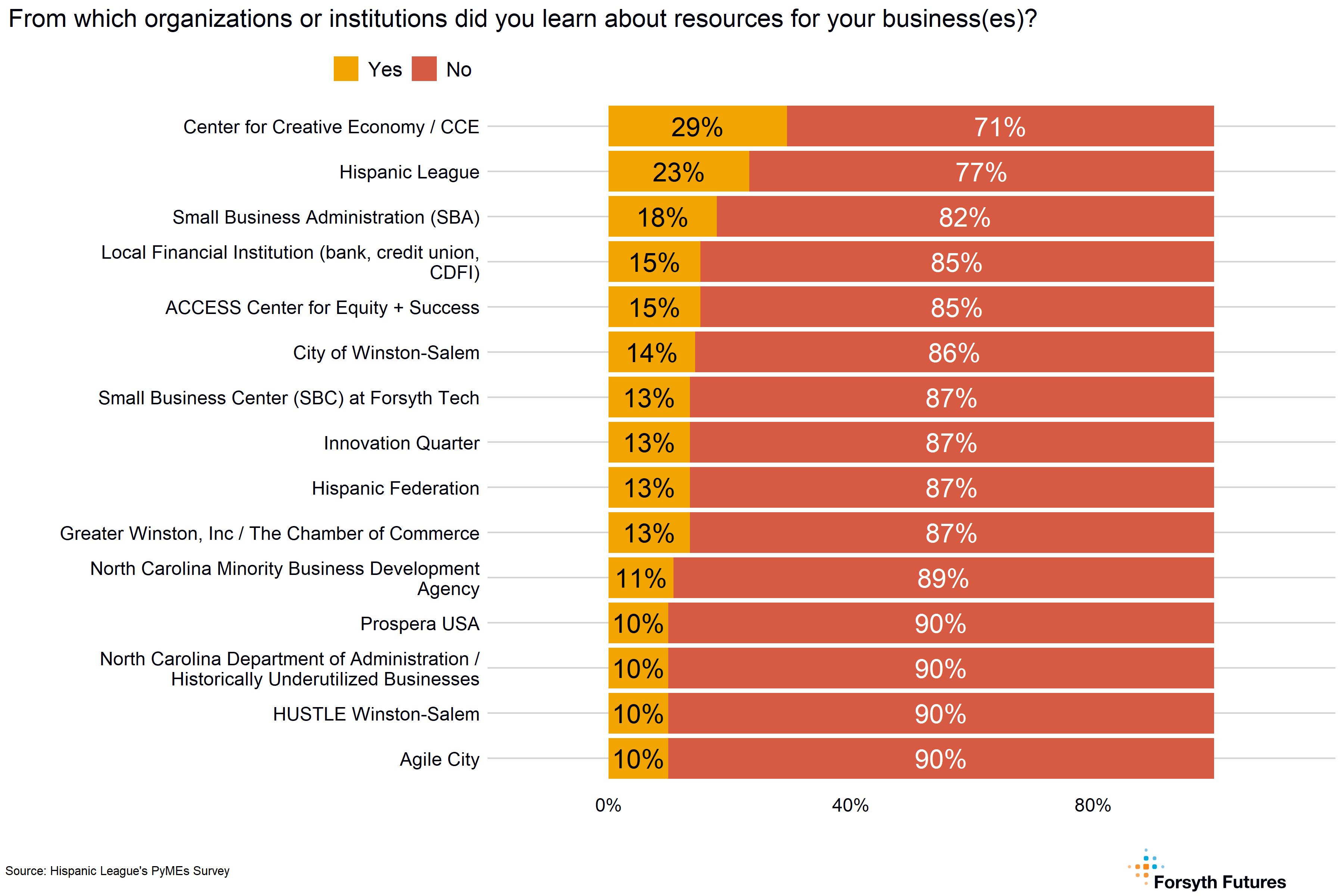 The graph above displays only the organizations with ten or more responses; there were 21 total Forsyth County organizations / groups for respondents to select, and they could choose all that applied. The most common organizations / institutions that respondents learned about resources from were the Center for Creative Economy (29%), the Hispanic League (23%), and the Small Business Administration (18%).