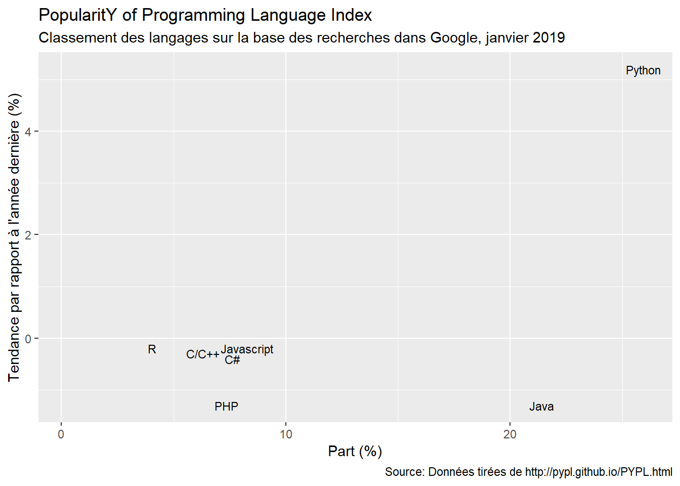 Ce qui apparait des différentes figures, c’est que R parvient à se tailler une place parmi les langages les plus populaires au monde. Et celà, malgré le fait que c’est une langage spécialisée. Si sur les dix dernières années, le langage s’est enrichi avec la diversification de ses contributeurs, il reste à la base un langage élaboré par des statisticiens pour des statisticiens. De ce fait, il est excéllent pour l’analyse de données, mais fort peu utile pour certaines tâches…comme le développement d’un site web.