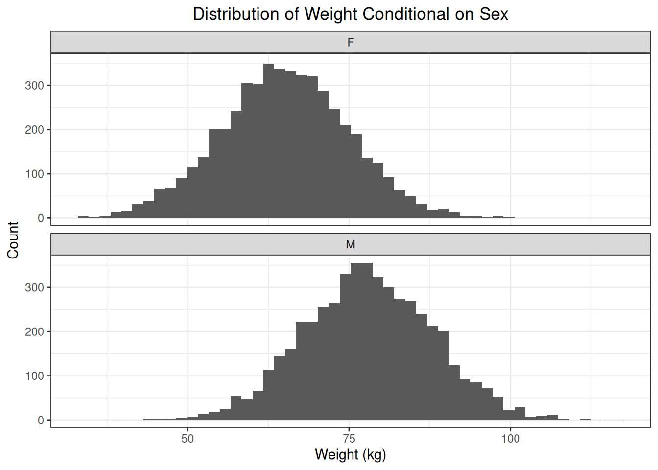 Our simulation setup involves simulating the weight of patients visiting their general physician (GP) for a checkup. For each patient, the sex (male, female) is always recorded. The data set is balanced in terms of sex, and we assume a normally distributed weight (kg) with a mean weight \(\mu_{f} = 65\) for women and \(\mu_{m} = 78\) for men. The standard deviation \(\sigma = 10\) is the same for both sexes: