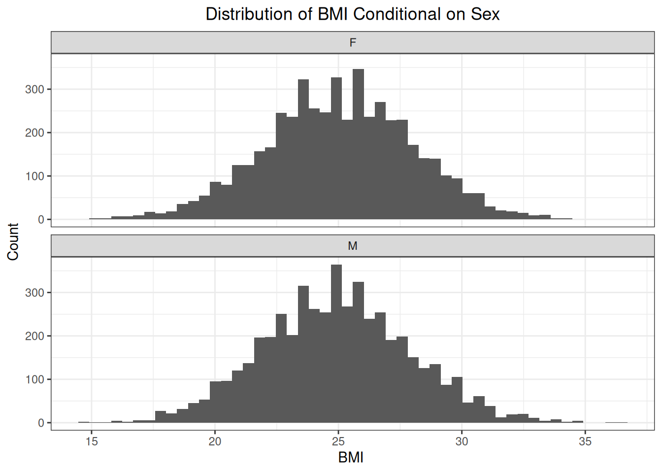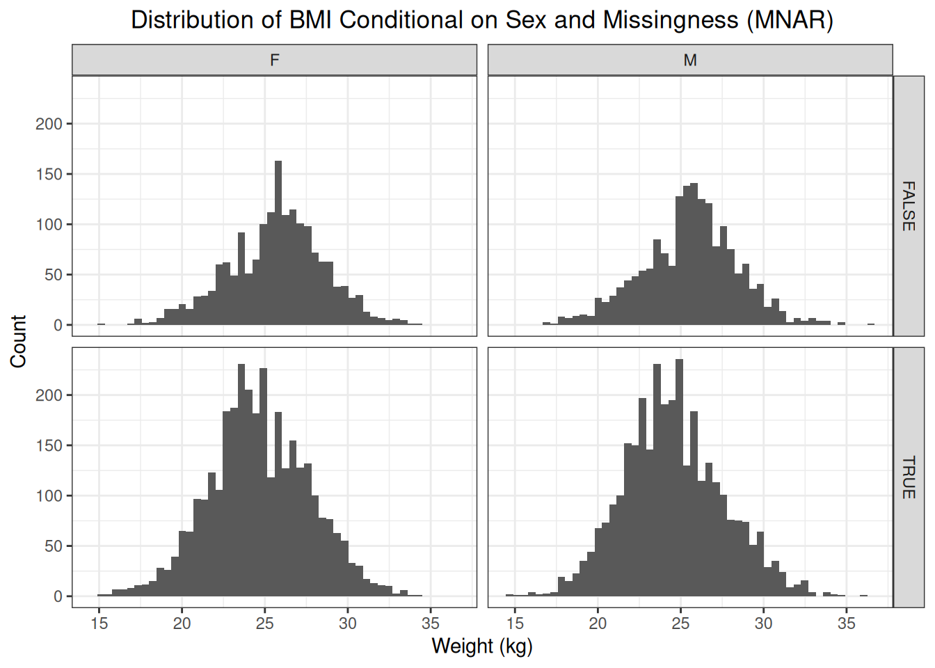 With missingness not at random, the probability of missingness is not affected by a factor that is recorded, but is affected by factors that are not recorded or even by the outcome itself. For this missingness pattern, we will not focus on the weight of the patient but on the patient’s BMI. The distribution of BMI is the same for women and for men: