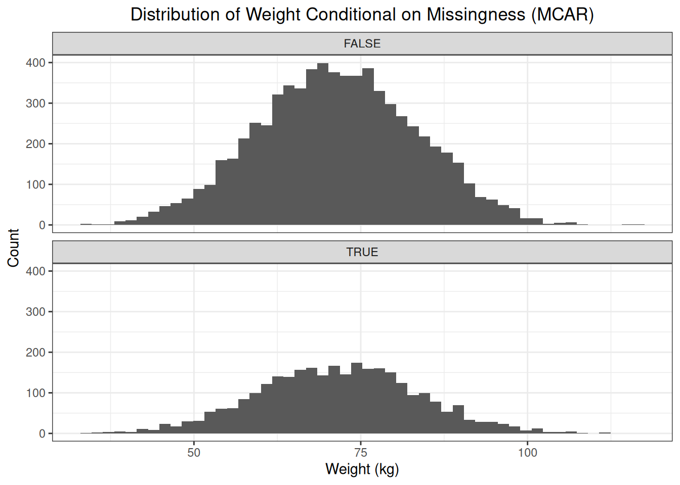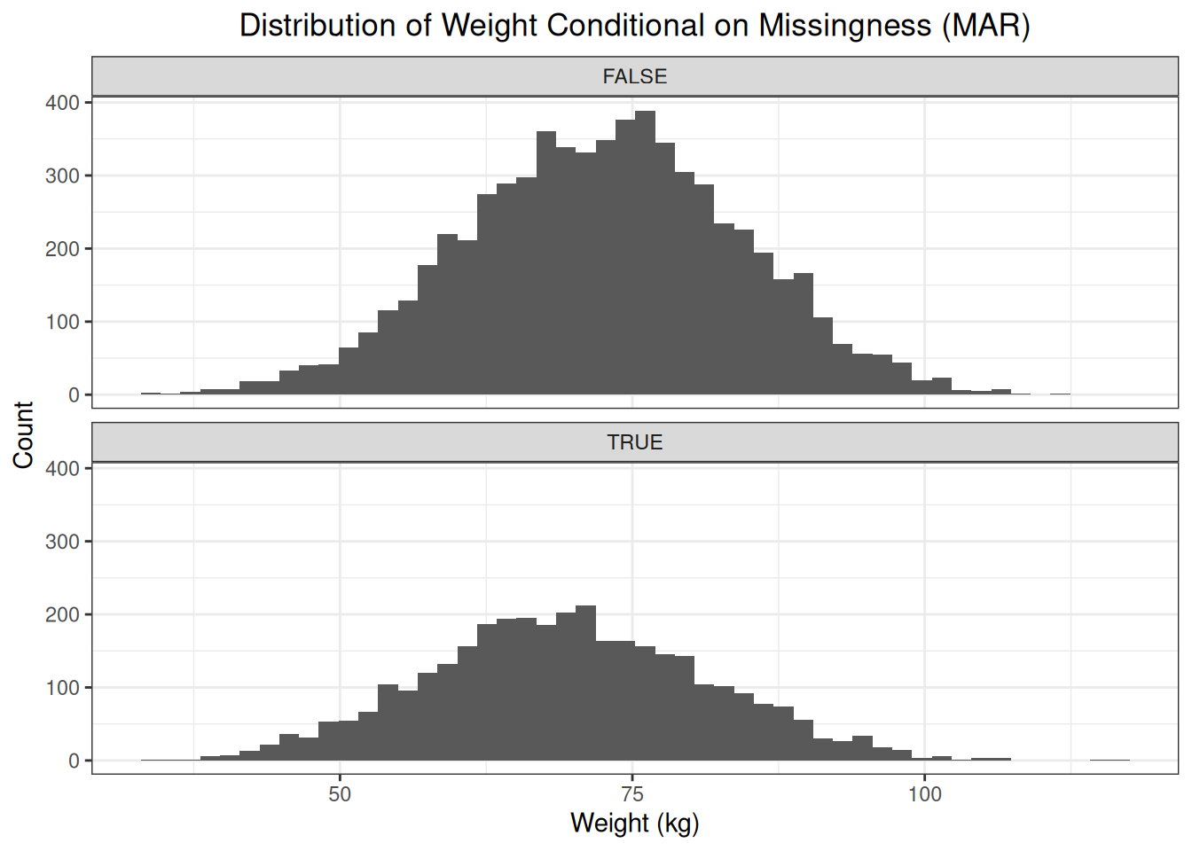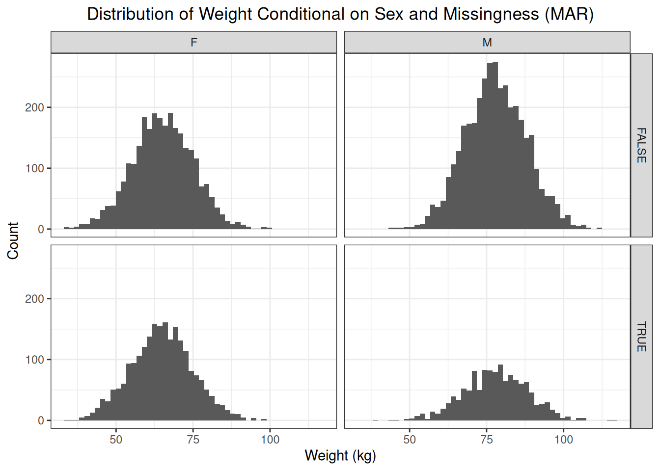 We can see that, conditional on sex, the distribution of observed and missing weights is the same. This illustrates the concept of missingness at random. Sex is the factor that influences both the probability of missingness and the outcome itself. Conditioning on this factors removes the difference in distributions of observed and missing weights.