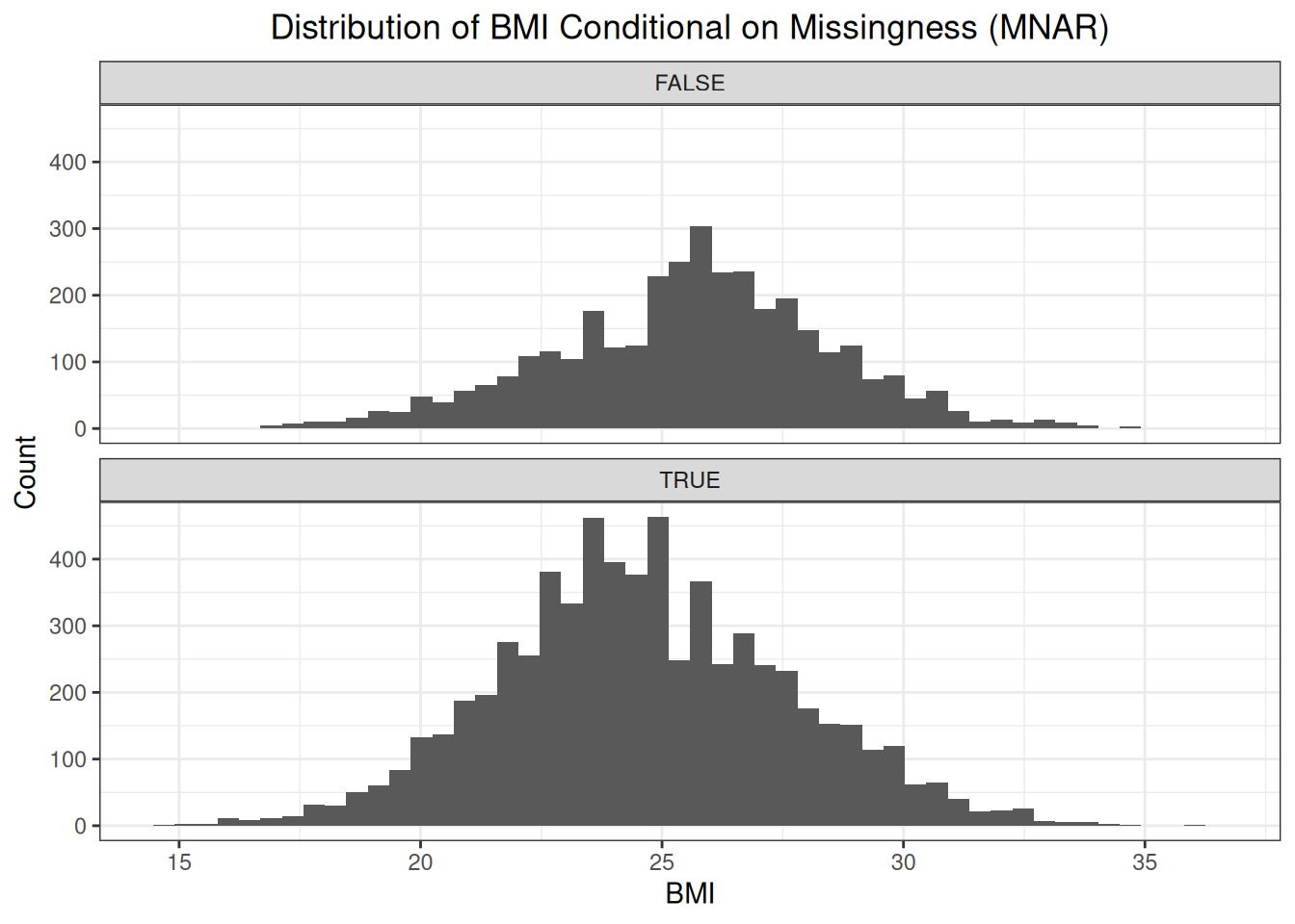 weights["mnar"] <- weights$idx %in% idxsFirst, let’s have a look at the distribution of BMI conditional on missingness.