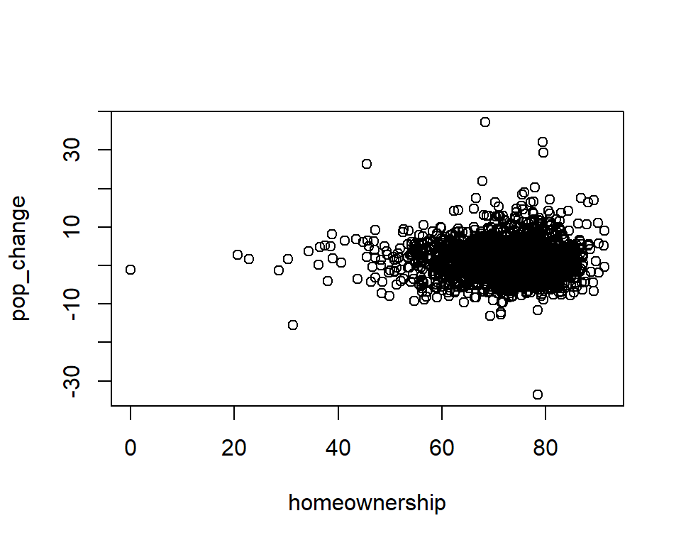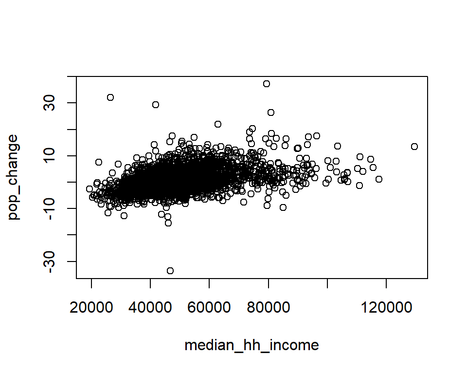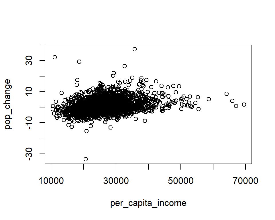 It is possible to see from the plots that some variables seem to be associated with pop_change. For example, per_capita_income and median_hh_income seem to be positively associated with pop_change. In the remainder of this chapter, we will look at ways to quantify such relationships.