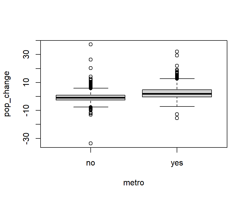 Let’s first work on the case in which the explanatory variable is categorical with 2 levels. To illustrate that, we’ll continue to consider pop_change as the response variable and will look at metro (whether the county contains a metropolitan area) as the explanatory variable.