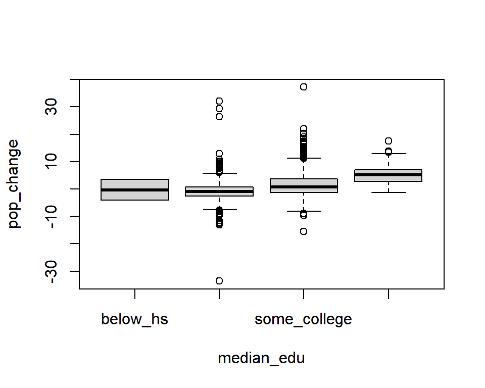 Suppose that we would like to gain a better understanding of the relationships between the variables in the dataset and the population change from 2010 to 2017, with the ultimate goal of identifying which variable is most associated with population change. We can use the plot function to look at scatterplots (or boxplots if the explanatory variable is categorical) of pop_change (y) versus each variable (x).
