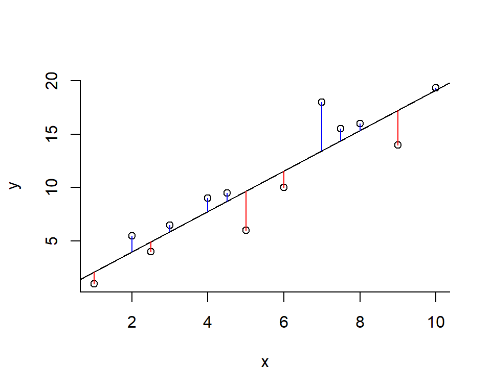 For example, for the line \(Y=2X\), the point \((5,6)\) in the dataset has the following residual: \(6 - (0+2\times 5) = -4\). For the line \(Y=-0.5+2X\), the same point \((5,6)\) now has the following residual: \(6 - (-0.5+2\times 5) = -3.5\).