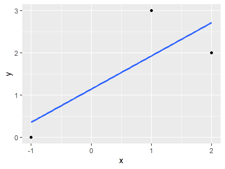 Example 3.1 Consider the data \((-1,0),(1,3),(2,2)\). To find the least squares line, we first find \(\hat{b}\) and then \(\hat{a}\). We also need \(\overline{X} = (-1+1+2)/3 = 2/3\) and \(\overline{Y} = (0+3+2)/3 = 5/3\). \[\begin{eqnarray} \hat{b} &=& \frac{\sum(Y_i - \overline{Y})(X_i - \overline{X})}{\sum(X_i - \overline{X})^2}\\ &=& \frac{(0-5/3)(-1-2/3)+(3-5/3)(1-2/3)+(2-5/3)(2-2/3)}{(-1-2/3)^2+(1-2/3)^2+(2-2/3)^2} = 0.7857.\\ \hat{a} &=& \overline{Y} - \hat{b}\overline{X} = 5/3 - 0.7857\times 2/3 = 1.1429. \end{eqnarray}\]
