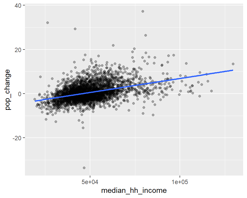 Notice that Pearson’s and Spearman’s correlations are very similar in this example. This is because the relationship between pop_change and median_hh_income are fairly linear.