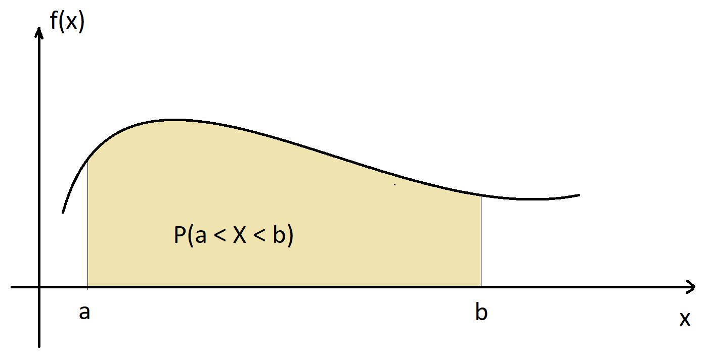 Definition 6.2 The probability density function (PDF) of a continuous random variable \(X\) is a function \(f:\mathbb{R}\rightarrow\mathbb{R}\) such that \(P(a \leq X \leq b)\) is the area under the graph of \(f\) between \(a\) and \(b\), as illustrated in the figure below. In mathematical symbols, \[P(a \leq X \leq b) = \int_a^b f(x)dx.\] The PDF satisfies: