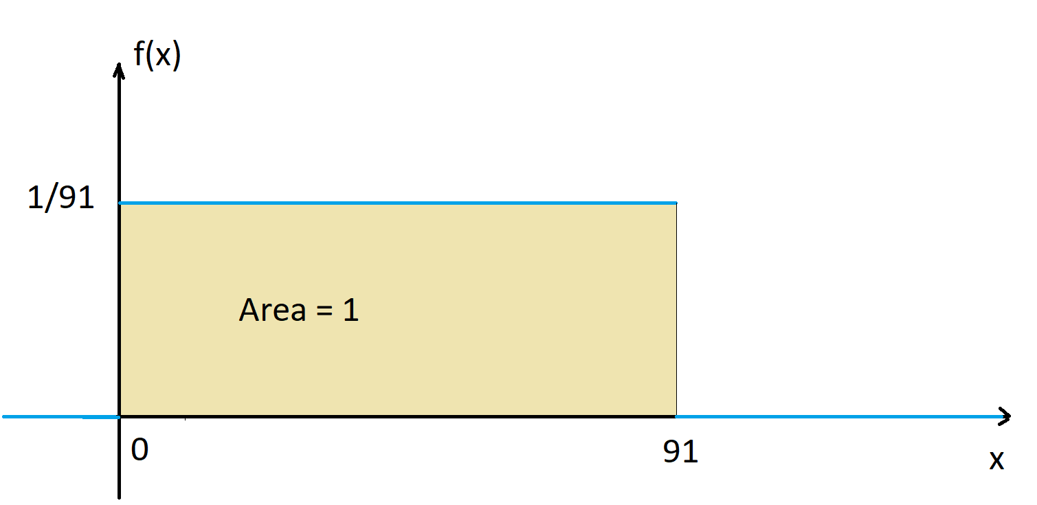 \[ f(x) = \left\{ \begin{array}{l} \frac{1}{91}, \quad \mbox{if } 0\leq x \leq 91,\\ 0, \quad \mbox{otherwise.} \end{array} \right. \]