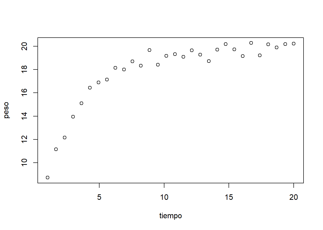 peso <- a - (a - b)*exp(-c*tiempo) + rnorm(n = 30, mean = 0, sd = 0.5)