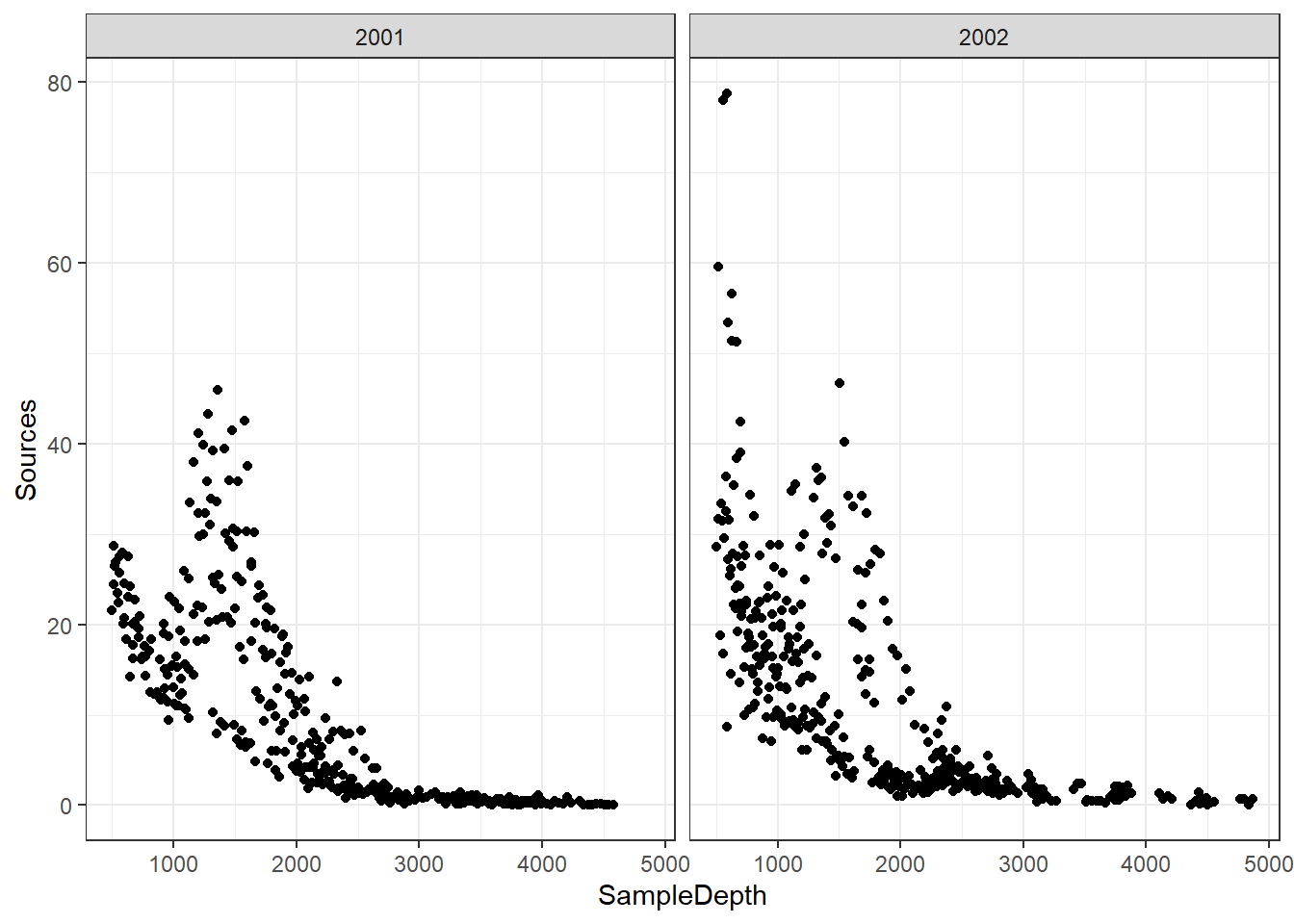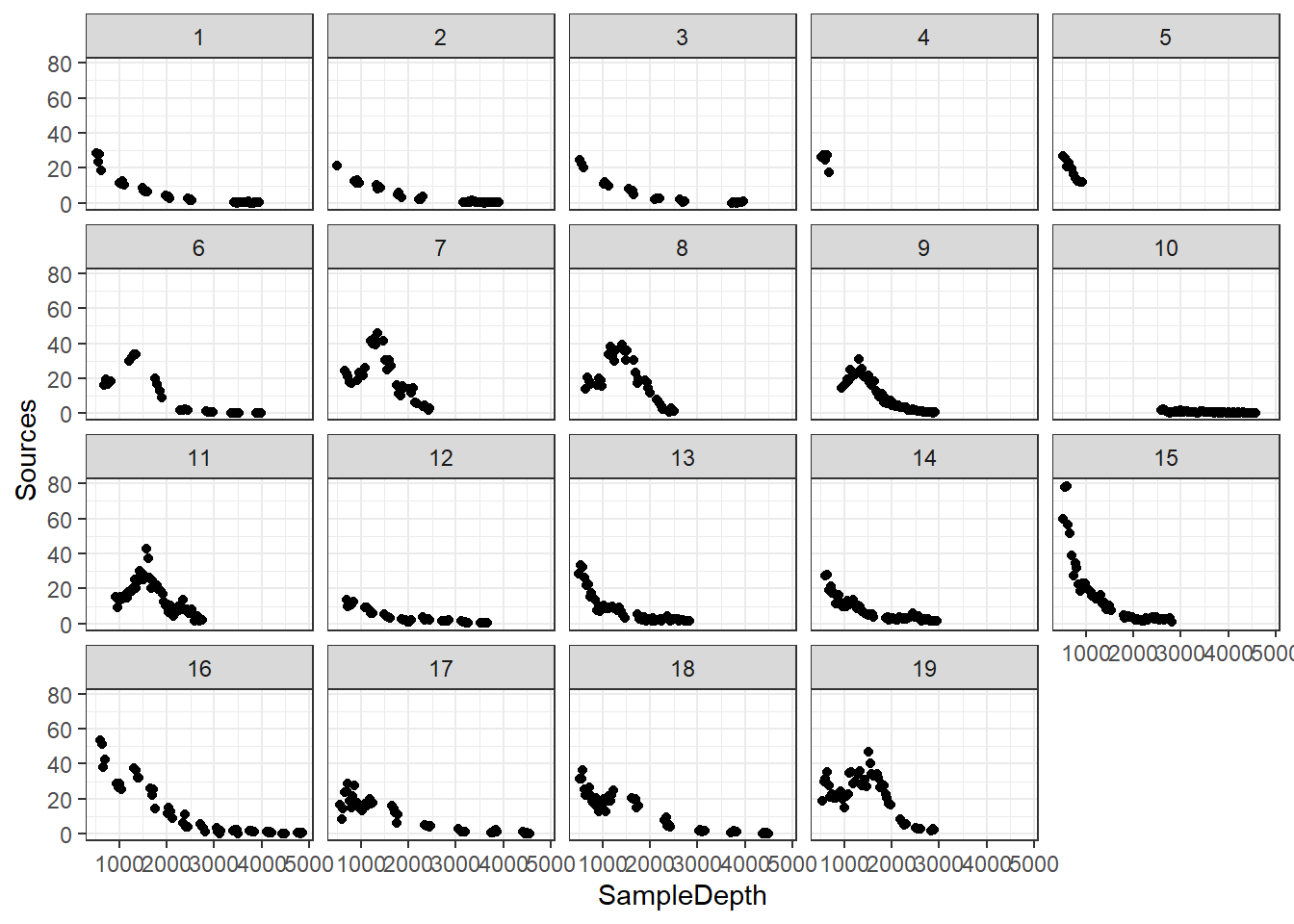 ## * SampleDepth : numeric predictor; with 30 values ranging from 501.000000 to 4866.000000.