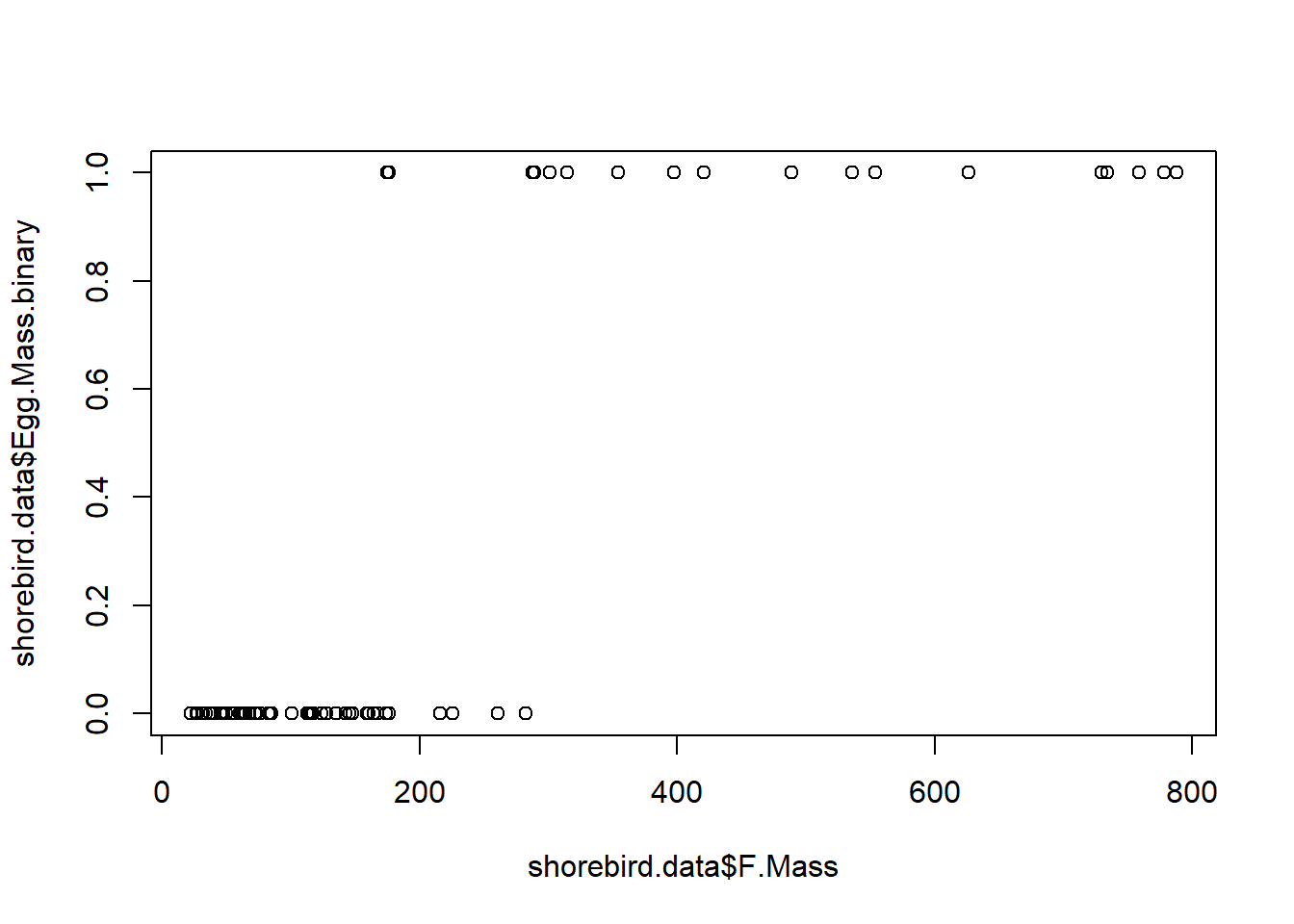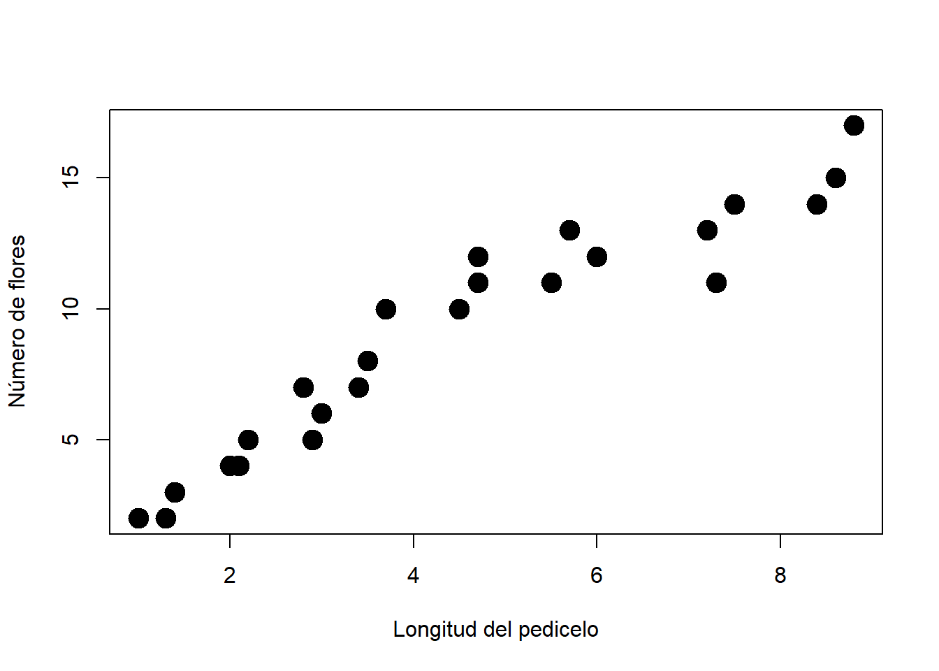 plot(plantas$long.pedicelo, plantas$nflores, pch = 19, cex = 2,
