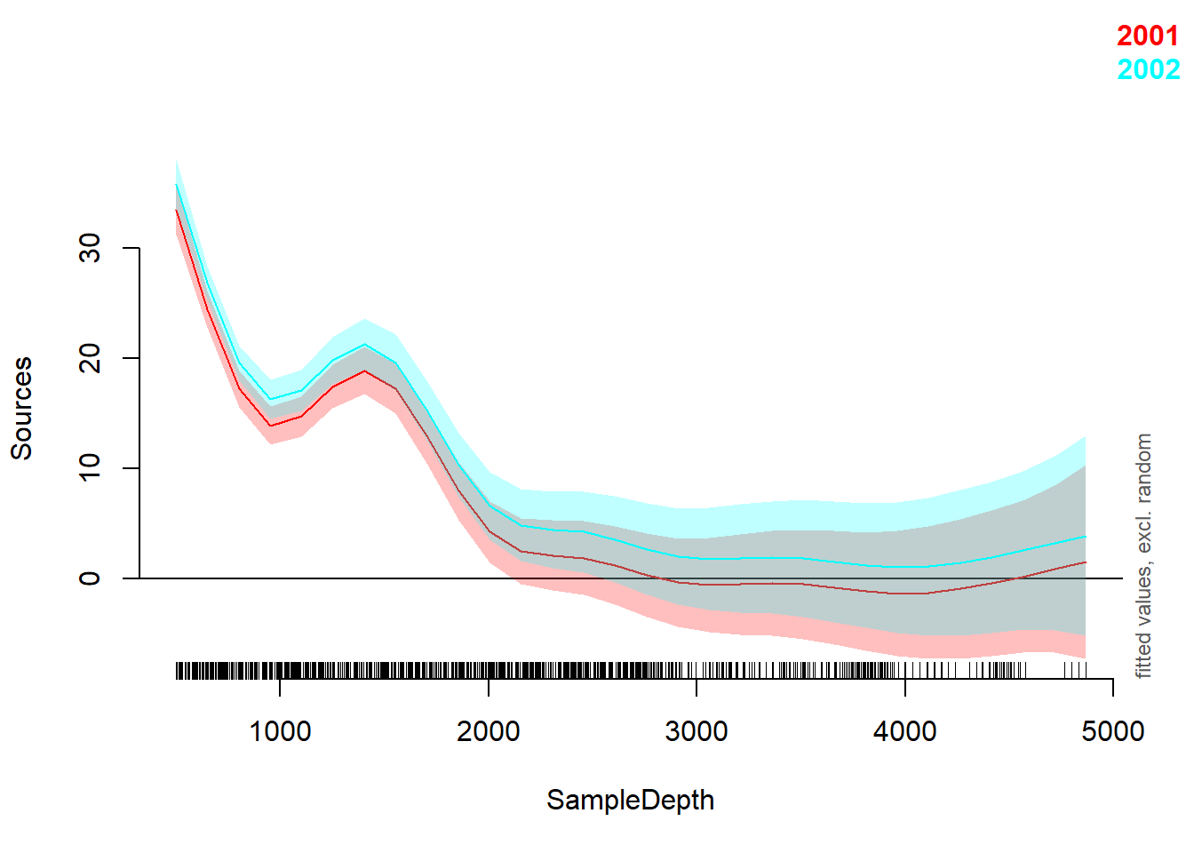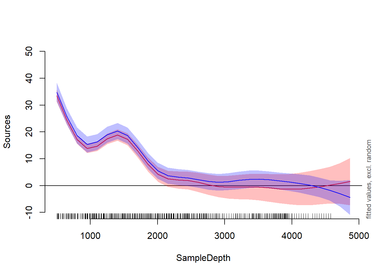 ## <tr> <td> s(SampleDepth) </td> <td align="right"> 8.8572 </td> <td align="right"> 8.9925 </td> <td align="right"> 53.0434 </td> <td align="right"> < 0.0001 </td> </tr>