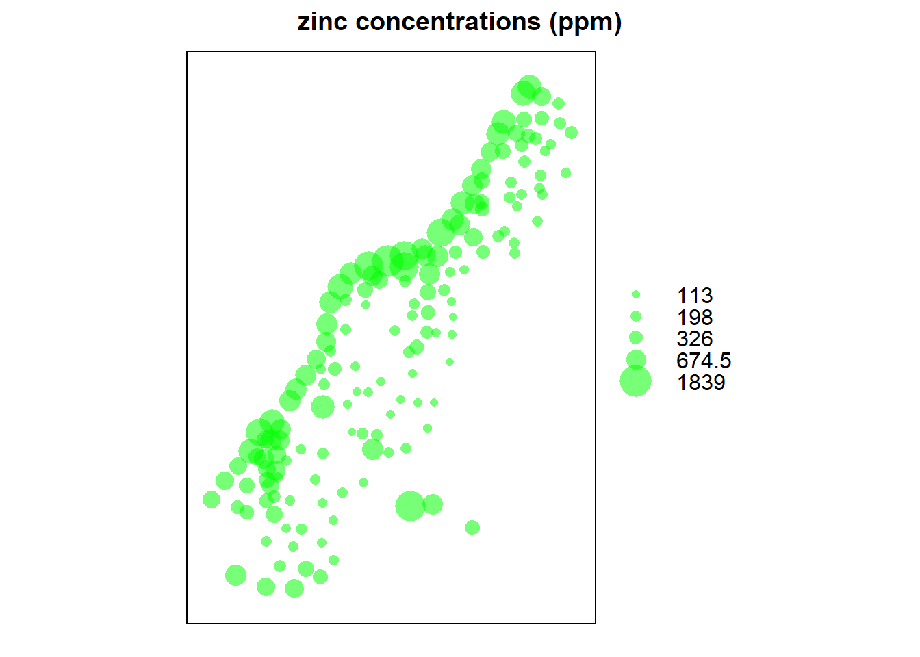 bubble(meuse, "zinc", col = "#00ff0088", main = "zinc concentrations (ppm)")