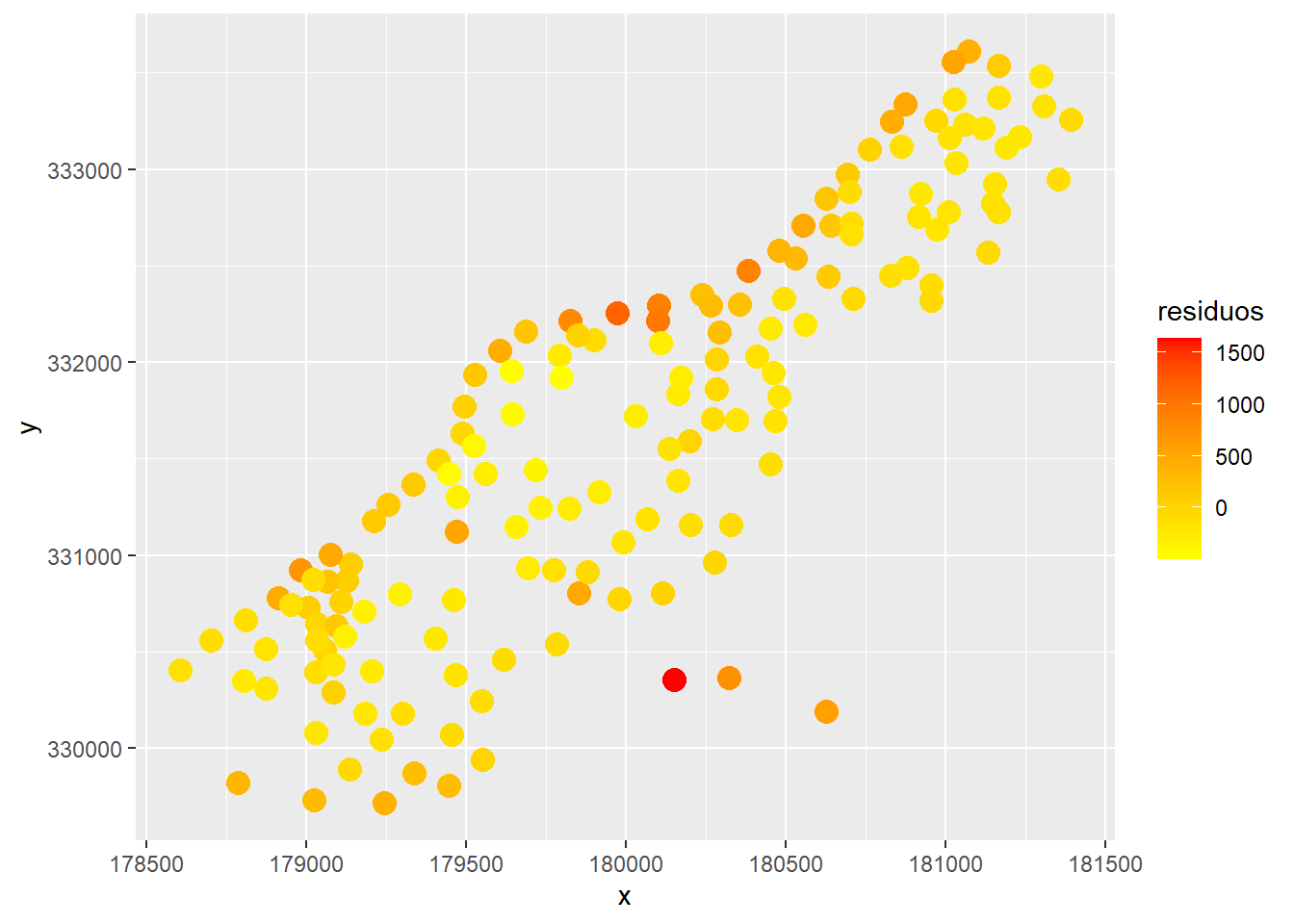 ggplot(meuse, aes(x = x, y = y, col = residuos)) +