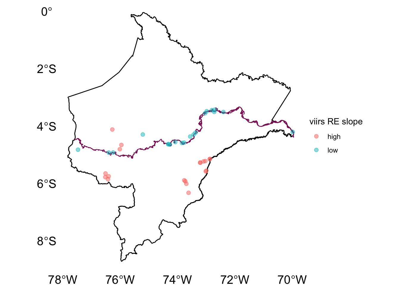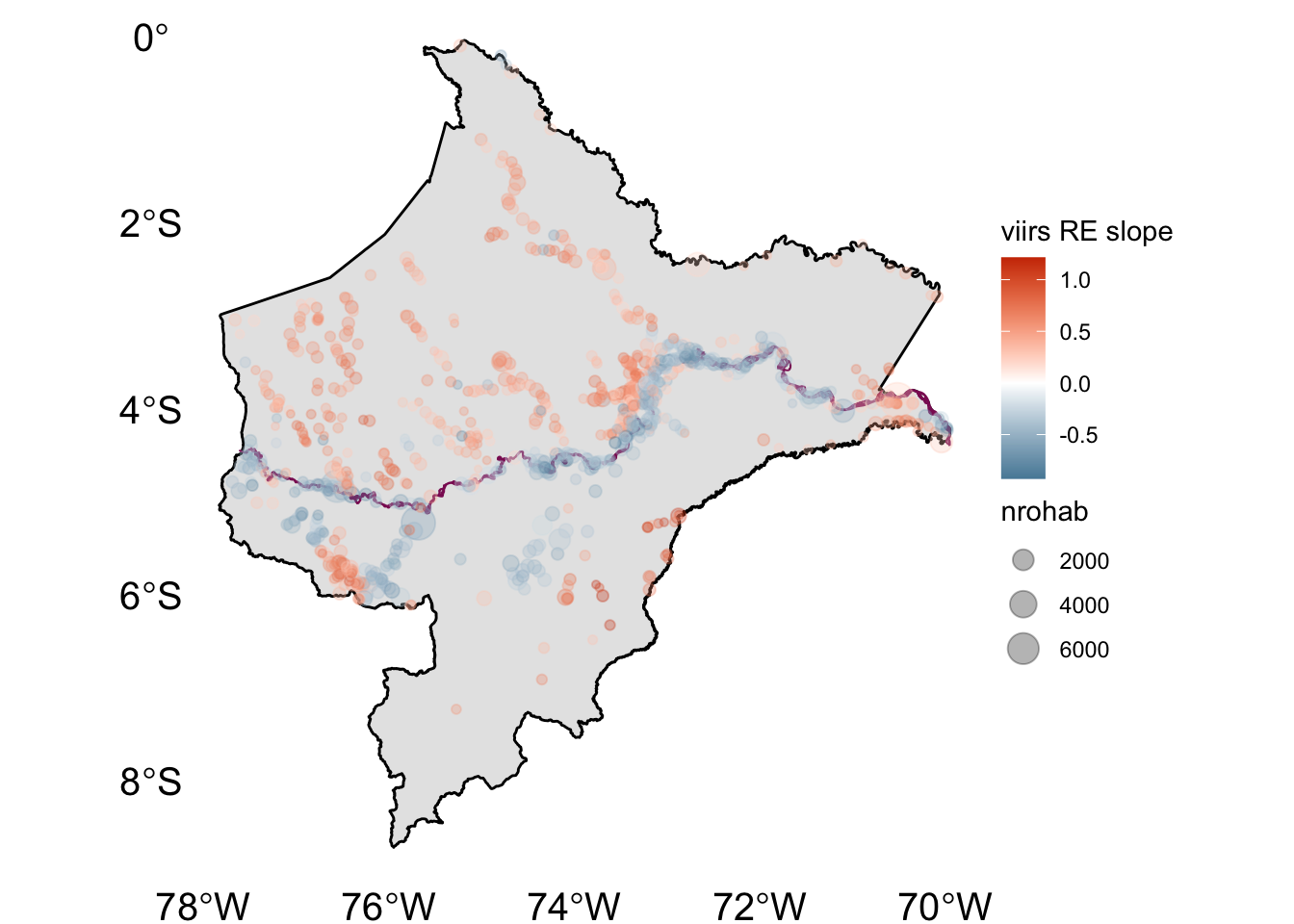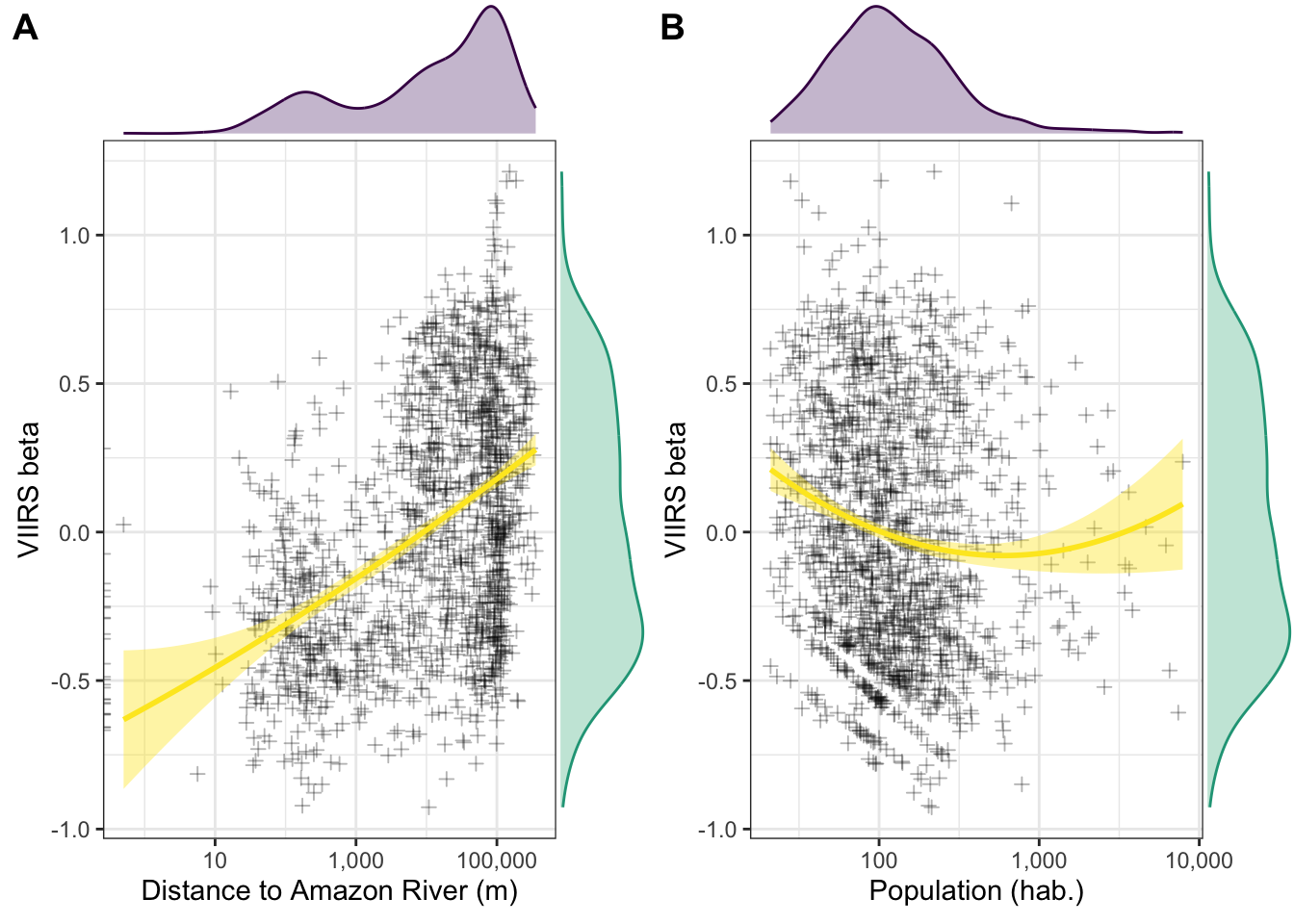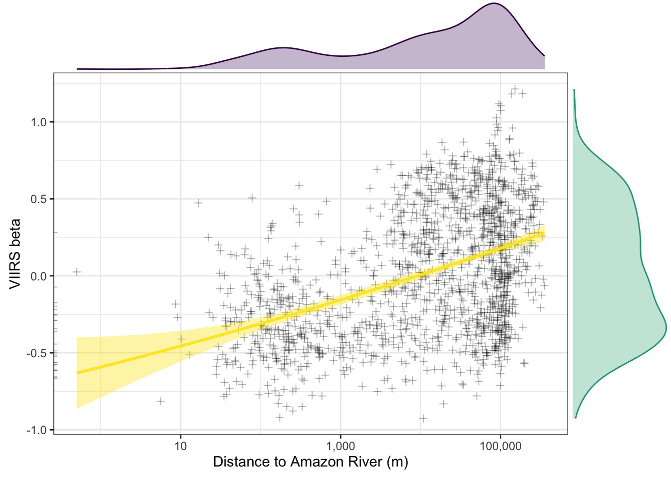 labs(x = "Distance to Amazon River (m)", y = "VIIRS beta") +