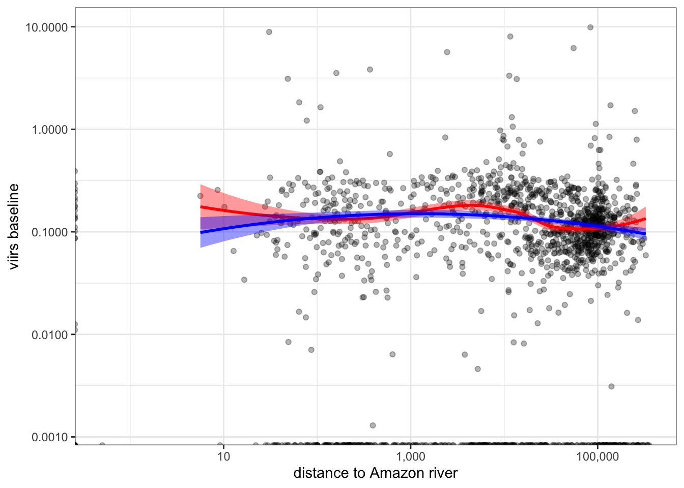 labs(x = "distance to Amazon river", y = "viirs baseline") +