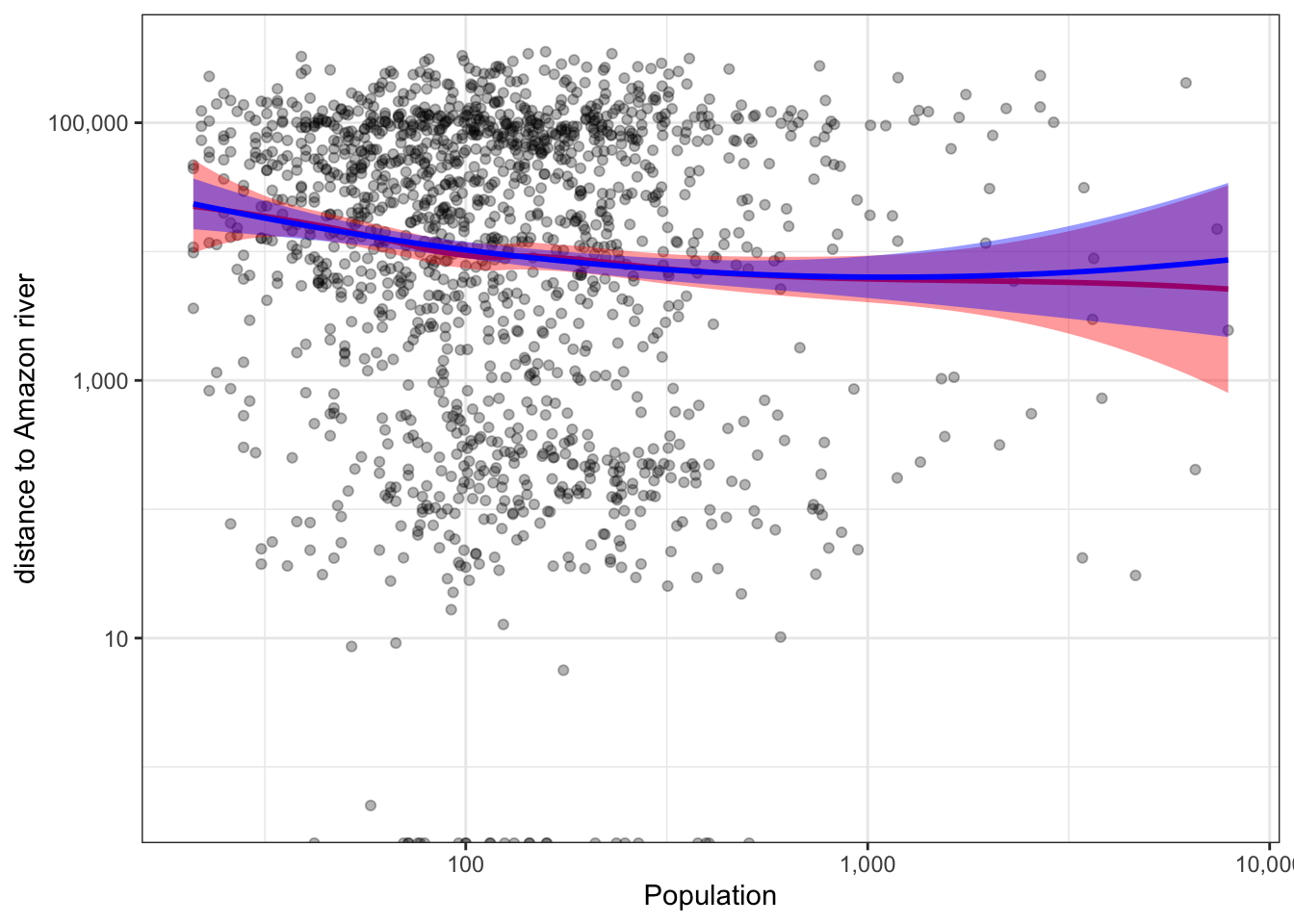 d <- read_csv("~/Dropbox/Work/SESYNC/Projects/Malaria/Village Level [Javier]/Analysis/output/dist_amazon.csv") %>%