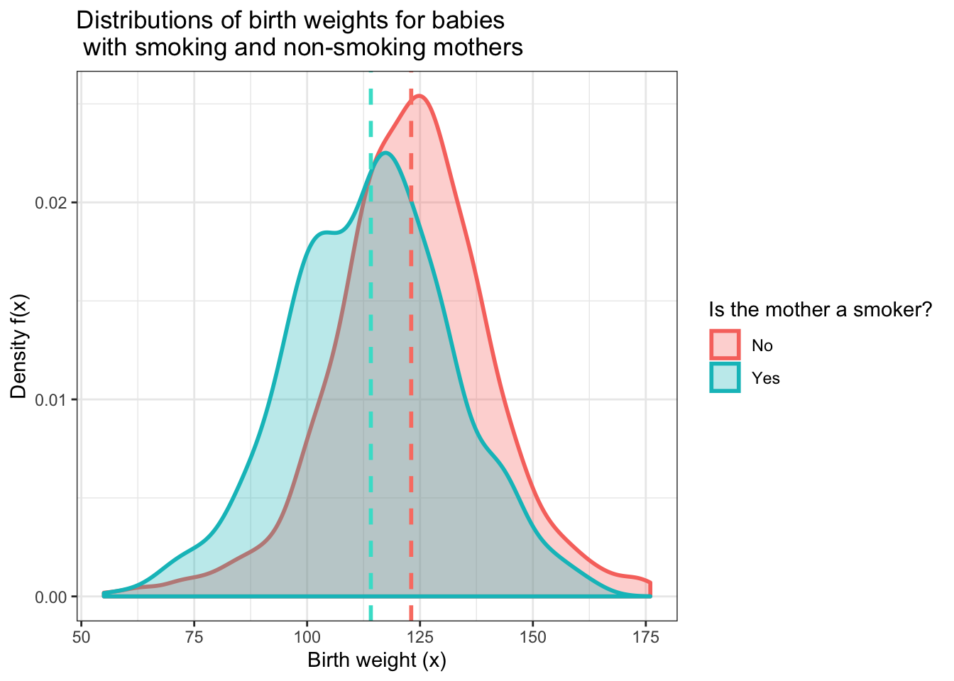 At birth, measurements on the baby were recorded. They included the baby’s length, weight, and head circumference. Provided here is a subset of this information collected for 1236 babies — those baby boys born during one year of the study who lived at least 28 days and who were single births (i.e., not one of a twin or triplet). The information available for each baby is birth weight and whether or not the mother smoked during her pregnancy.
