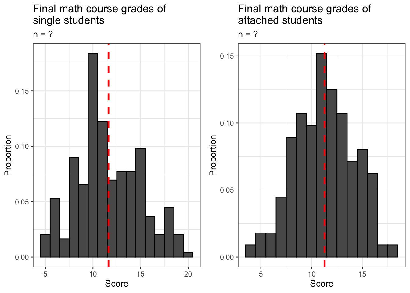 - Is there sufficient evidence to conclude at a 95% level of confidence (or 5% significance level) that single students have higher final math grades than attached students? Interpret the results in a few sentences.