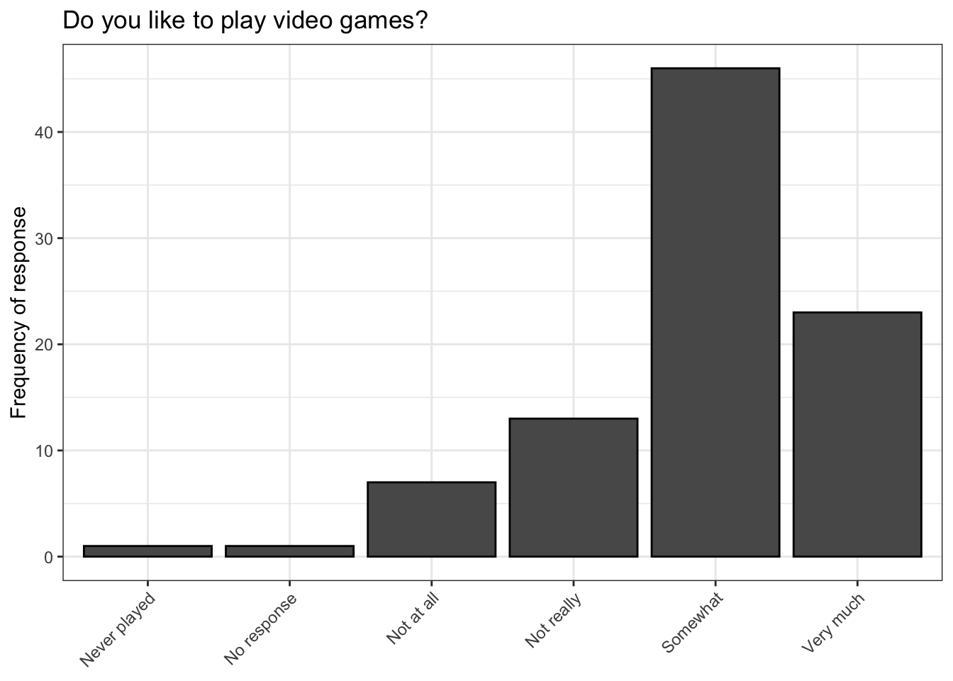 One person did not respond to the question and another answered that they had never played video games on any platform before. Keep these findings in mind because we will be returning to them later.