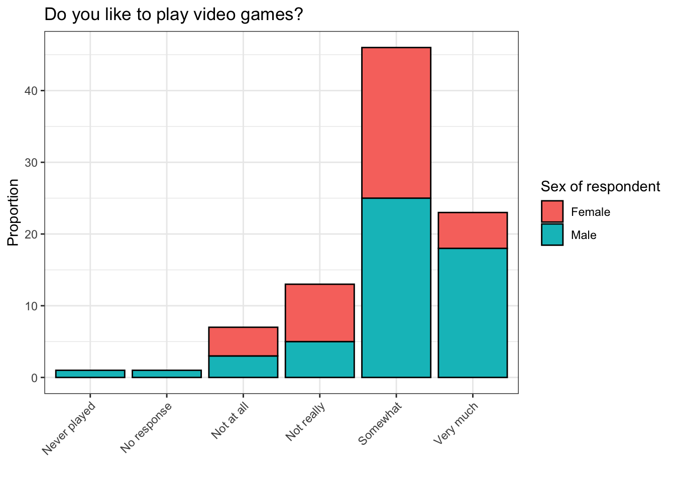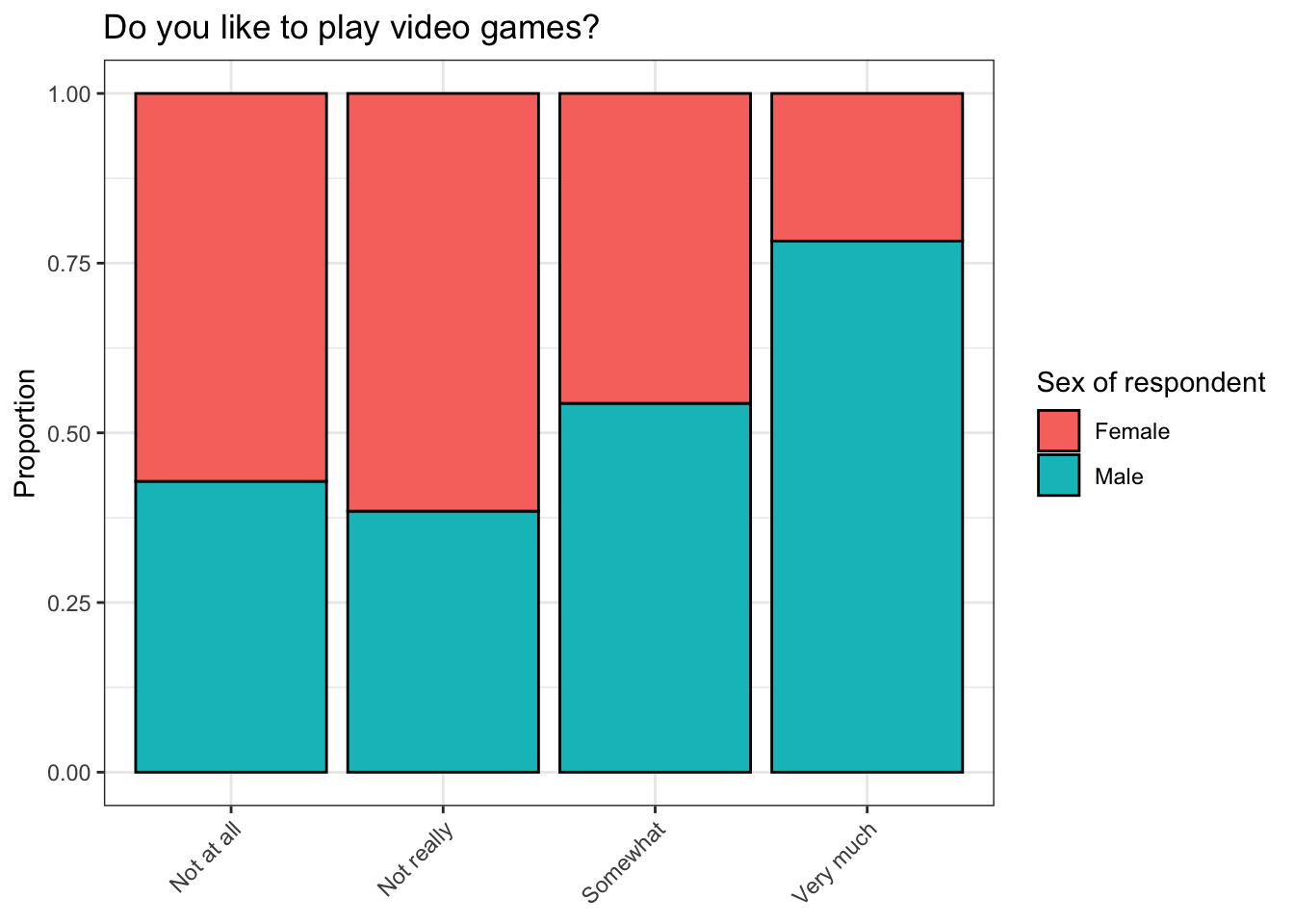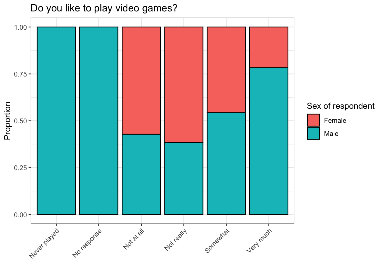 The plot above is called a stacked bar plot. Instead of plotting the frequency at which males and females responded to a certain question in a certain way, it shows what proportion of each response was given by males and females. I.e., approximately 75% of respondents who said they like to play video games very much were male, and about 25% were female.