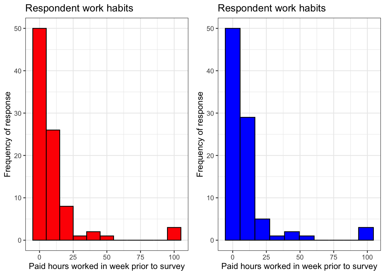 The red histogram on the left has a binwidth value of 10 and the blue histogram on the left has a bins value of 10. If you look very closely, you will notice that these histograms are not identical. 10 bars would fit in the left plot and 9 bars would fit in the right plot, although it is somewhat hard to tell because we lack values for work that would fit into some of the bars in both plots.