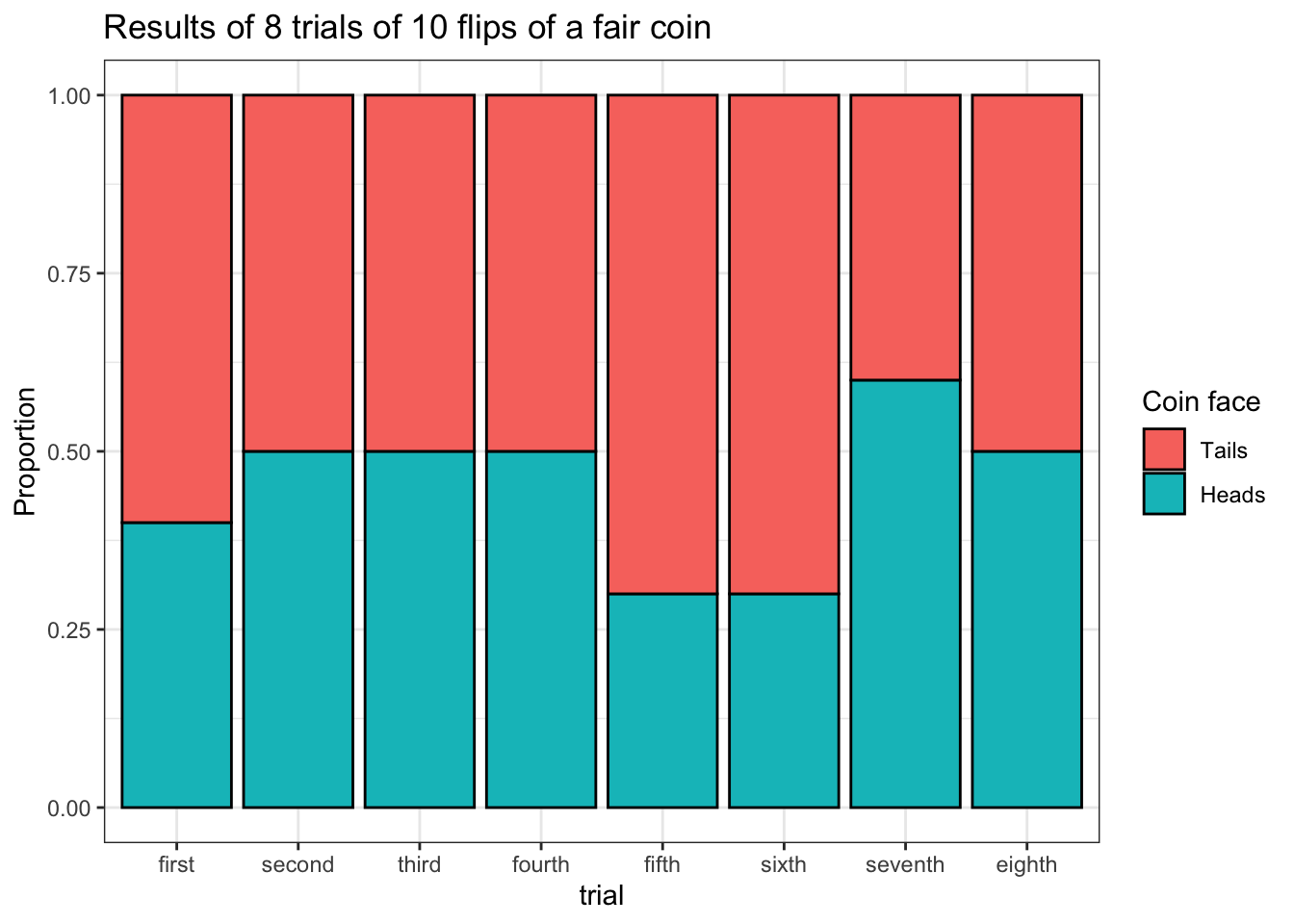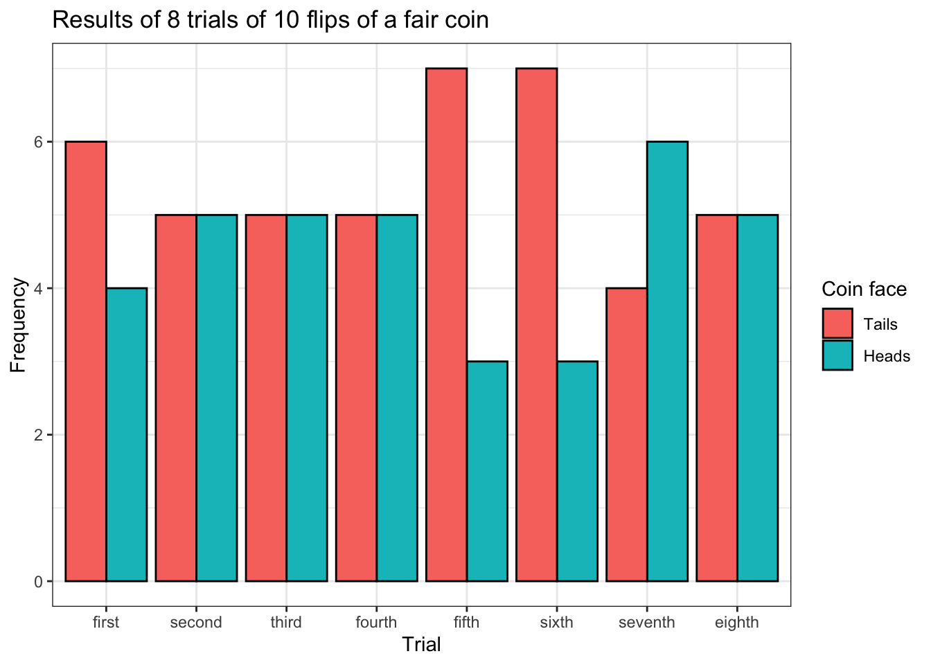 labs(title = 'Results of 8 trials of 10 flips of a fair coin',