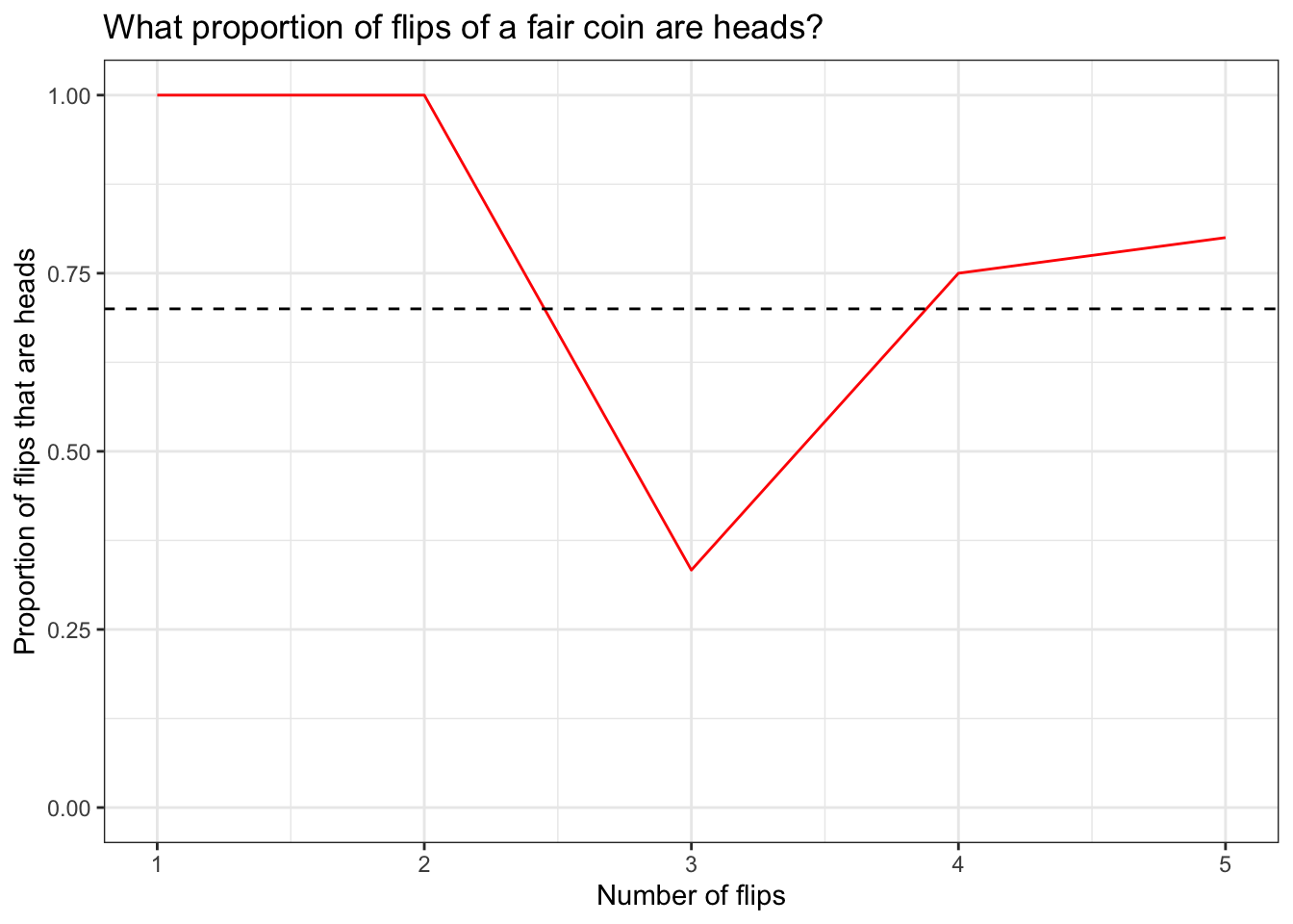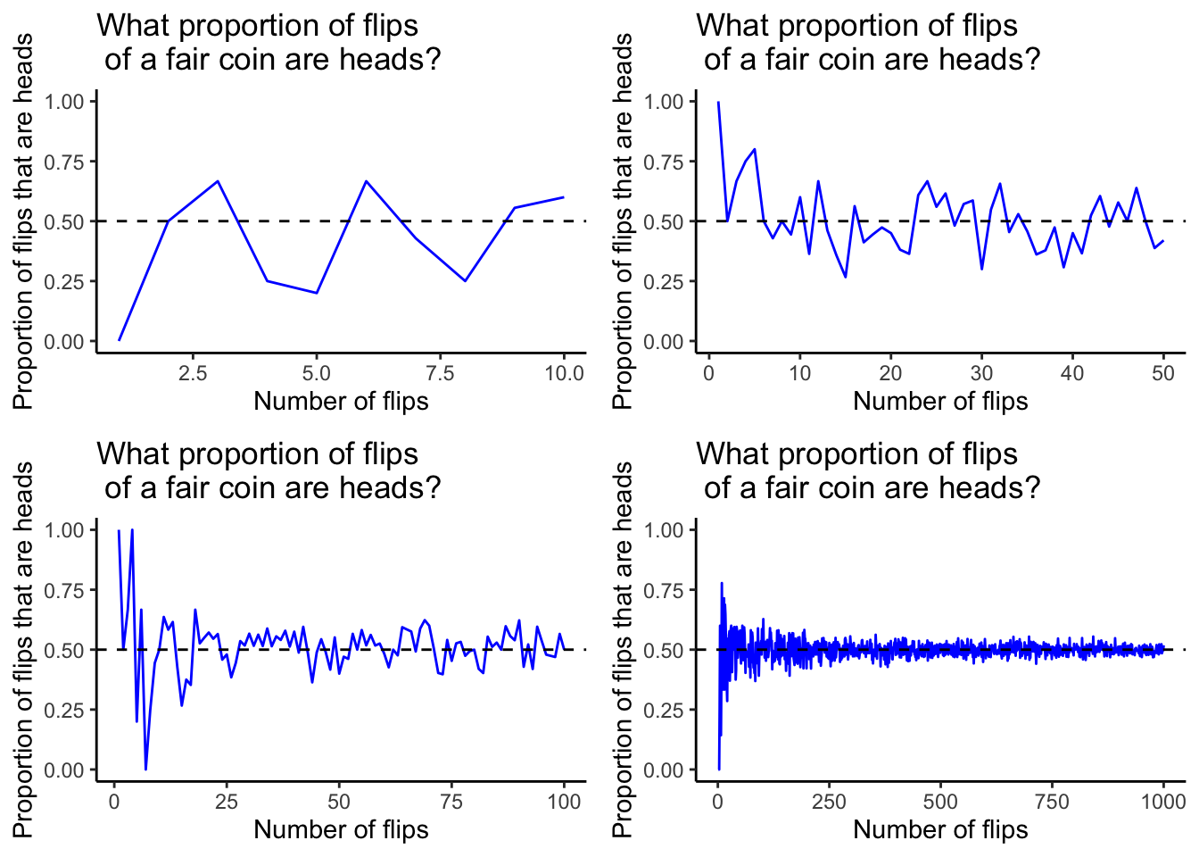 Notice that as the number of flips increases, the proportion of flips that are heads converges towards the probability that a single flip of a fair coin will land on heads.