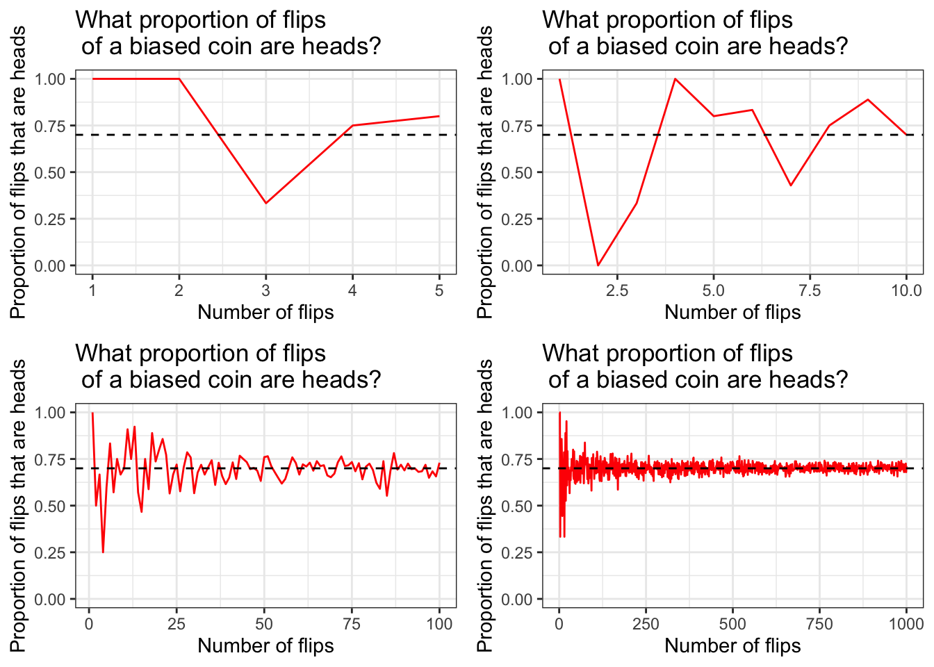 Great! Notice the position of the horizontal dashed line in each plot. It’s drawn at y = 0.7 because 0.7 is the probability of flipping heads with our biased coin.