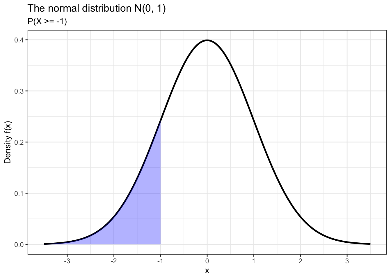 We can use pnorm() to calculate cumulative probabilities. For example, let’s calculate the probability that our random variable X takes a value less than or equal to -1. We can also plot this probability by shading the appropriate area under the normal distribution curve in ggplot2.
