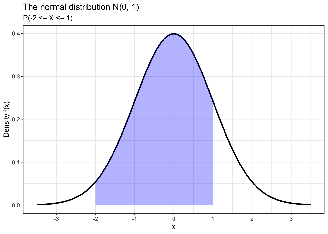 We can also calculate the probability that X takes some value within a certain interval. For example, let’s calculate P(-2 <= X <= 1) and plot this probability using ggplot2.