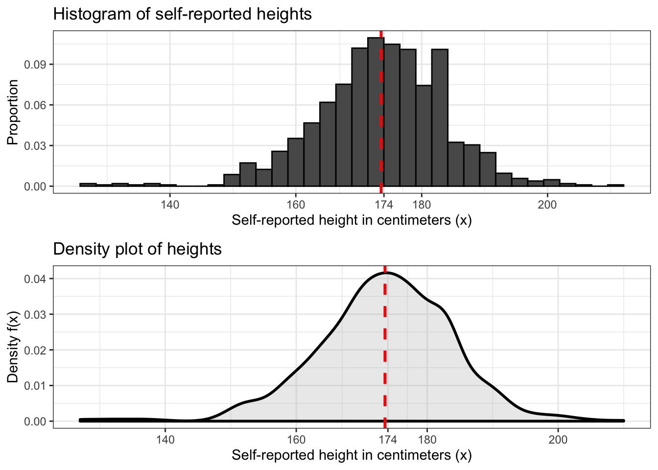 One thing that you may have been thinking throughout this part of the tutorial is that the density plot for female heights looks like the normal distribution. This is actually a reasonable way to think about this. If we draw a normal distribution curve over this density plot, we can see that it fits pretty well. The main reason why it’s not a perfect fit is because the number of observations is relatively small, so there is a lot of random variation. If our sample size was much larger, we would see a much better fit.