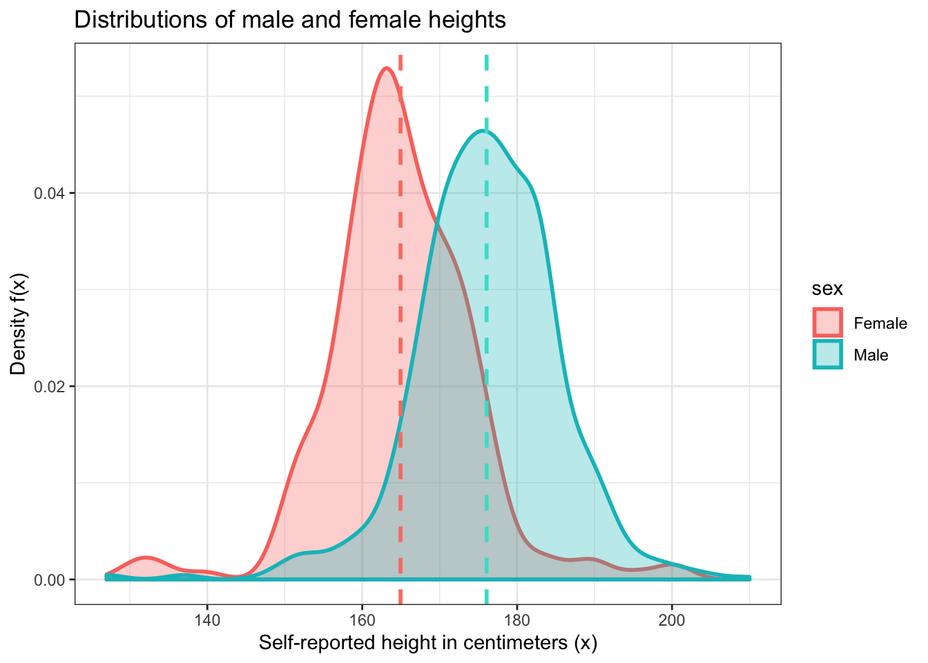 Now let’s do something a little more interesting. Let’s make density plots for male and female heights and plot them on top of each other to see which sex in this dataset tends to be taller. You can probably already guess which group, but we need to show this visually.