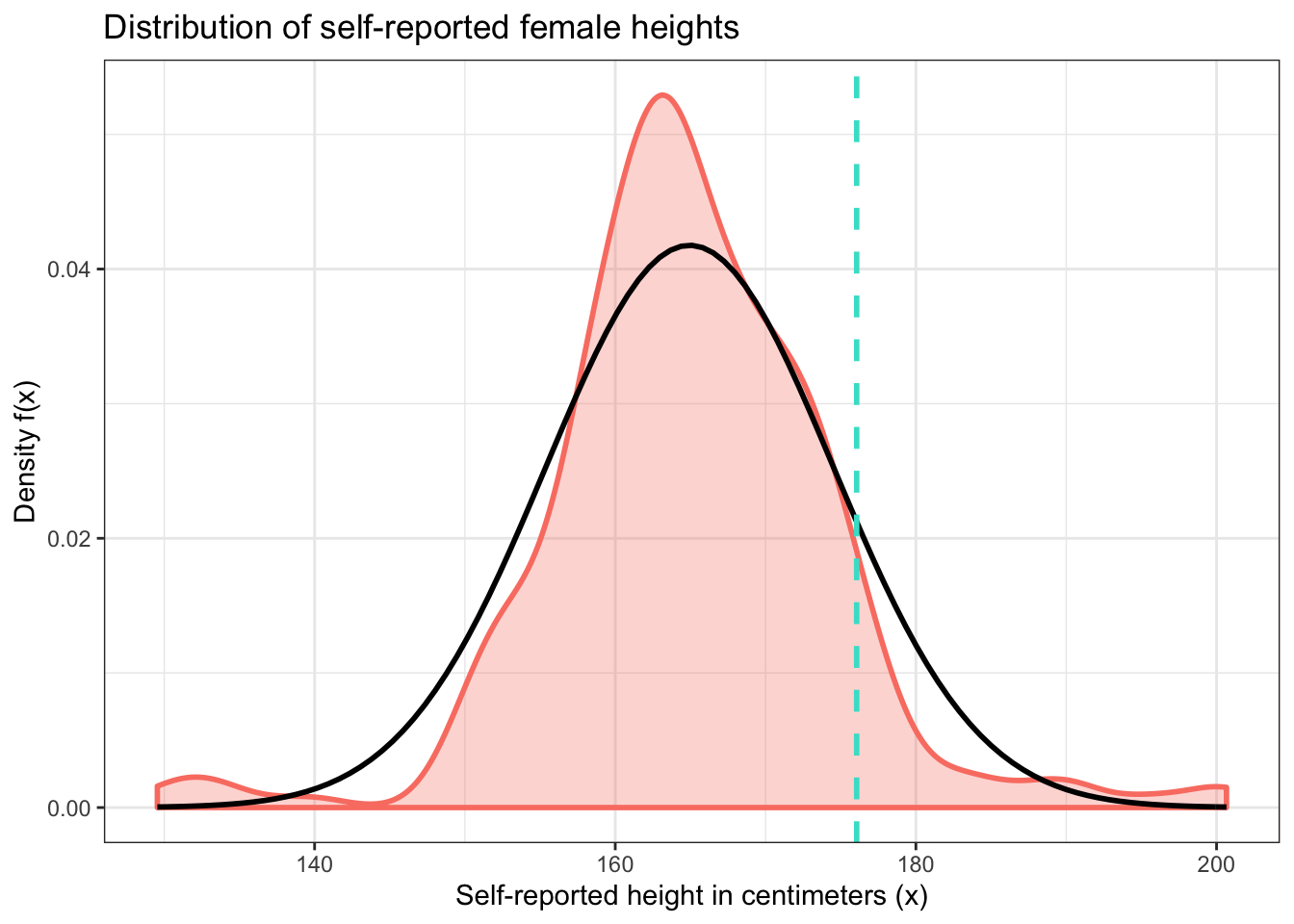 These values are somewhat close, but random variation in the sample keeps them somewhat far apart too. Notice how the areas under the density curves to the right of the dashed line above differ from one another. Should we trust our sample or the normal distribution more? It depends on what question we’re trying to answer. But in general, the normal distribution is more useful because it applies to the entire population of women, and not just those in our sample.