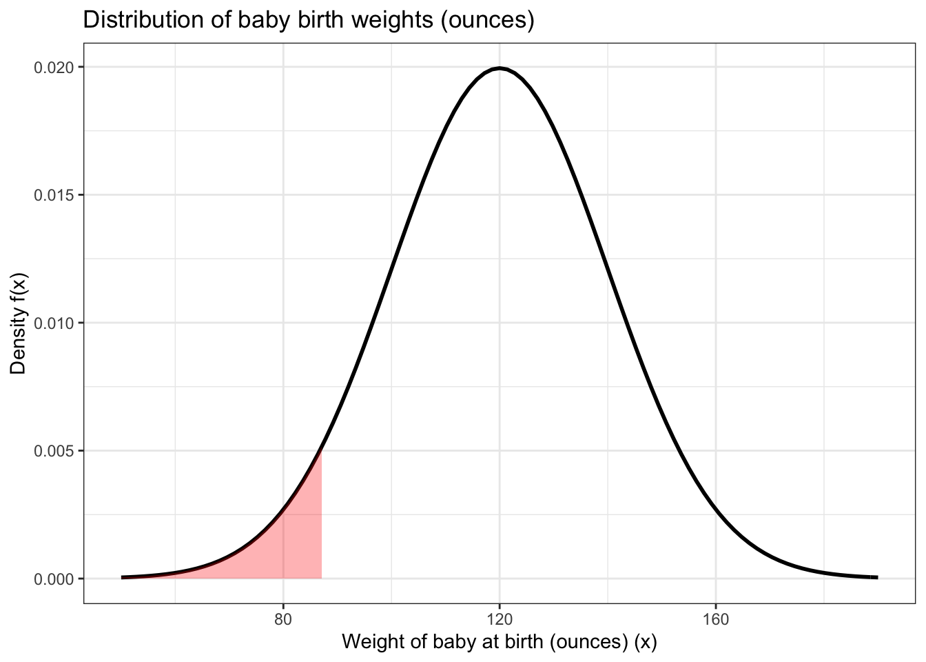 This returns a value of about 87.1 ounces. The shaded area under the curve above represents the population of babies that are of low birth weight.
