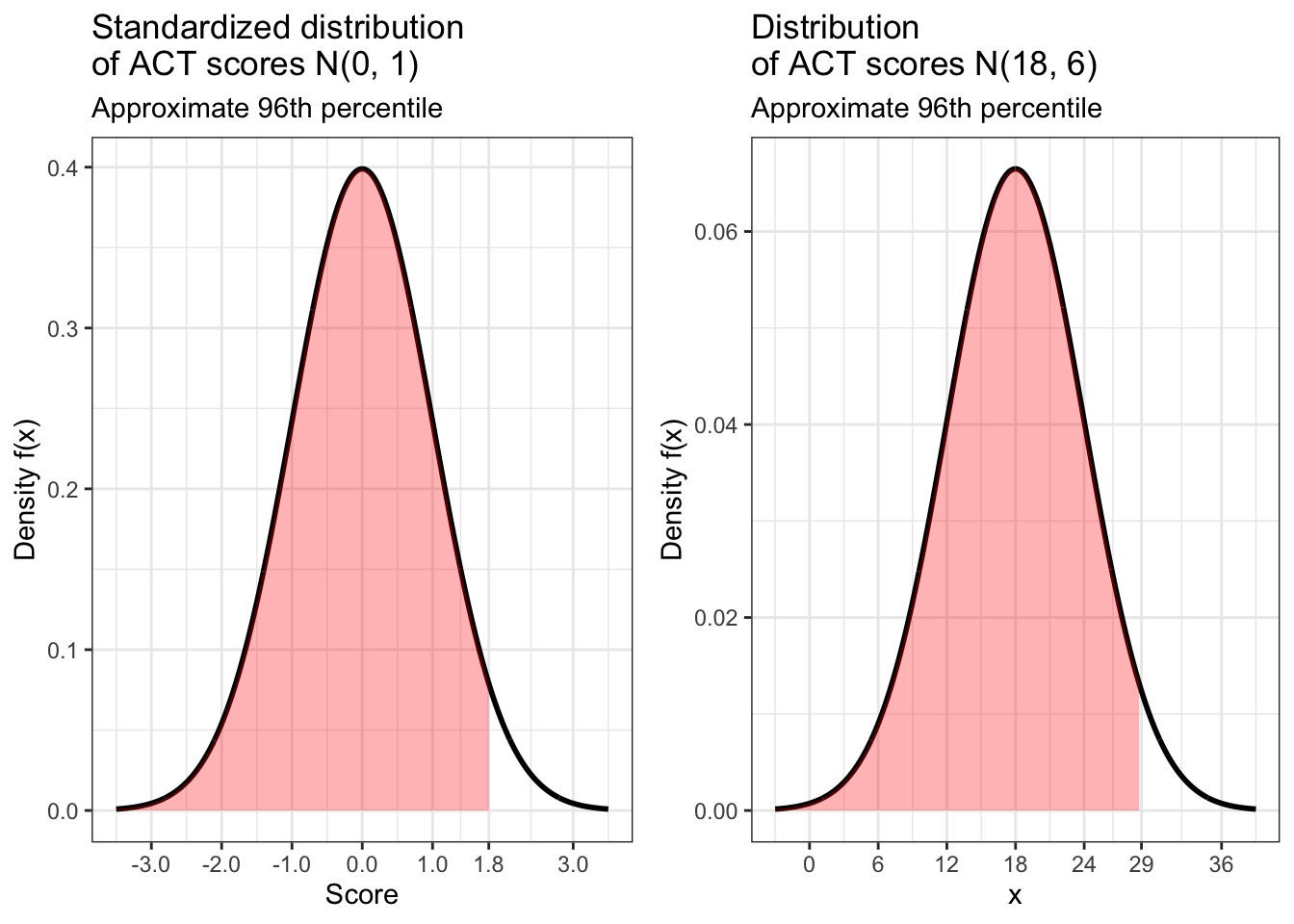 This answer tells us that Jill’s score is 1.8 standard deviations above the average for the SAT. This corresponds to a score that is in about the 96th percentile, meaning she did better than about 96% of students who took this test. Below are standardized and non-standardized visualizations of this result.
