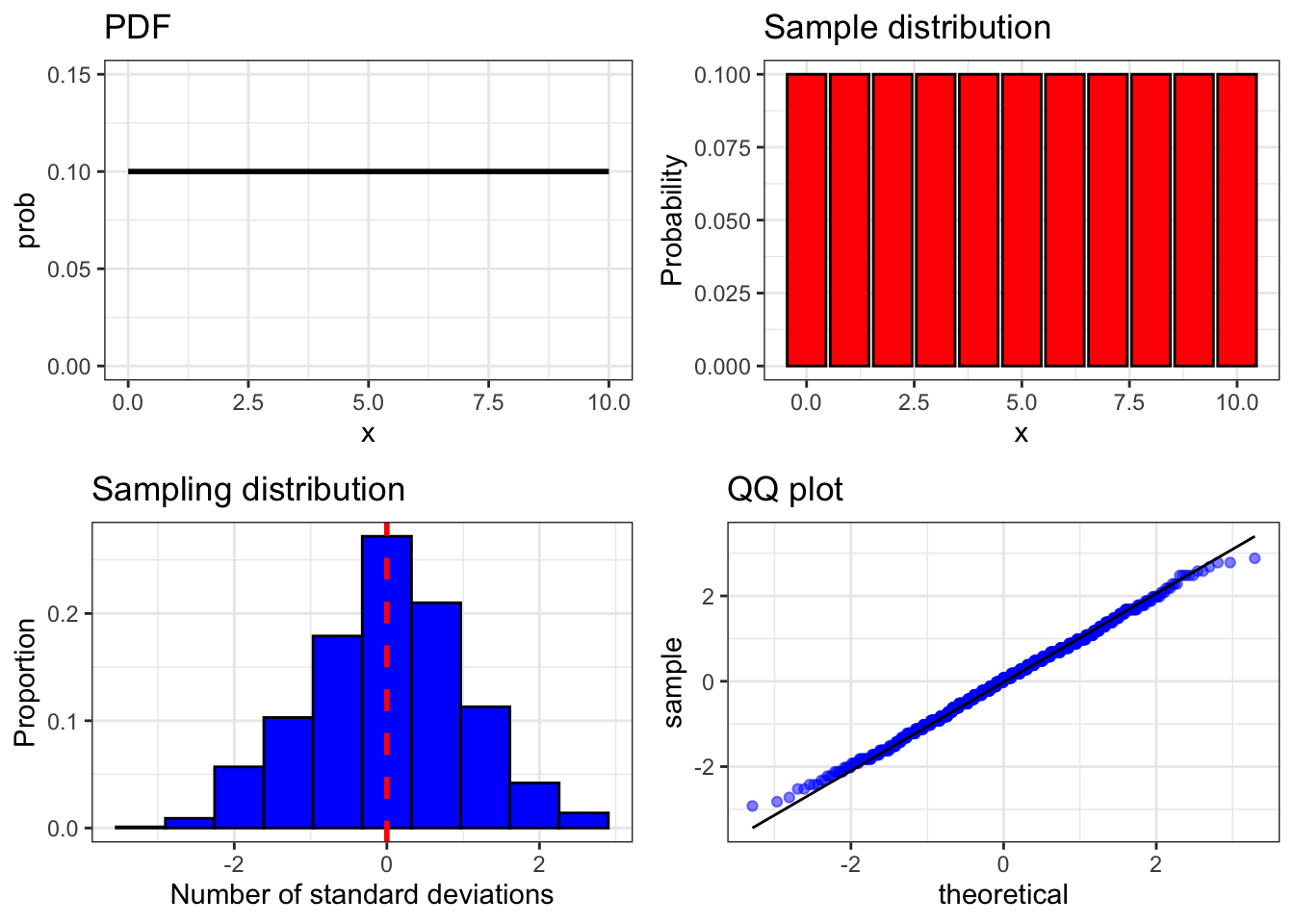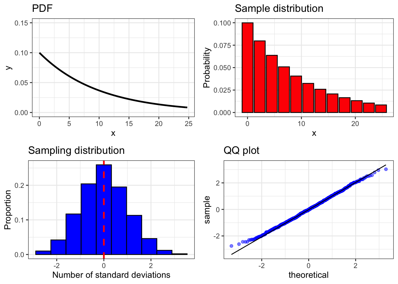 ggarrange(pdf, samp_dist, sampling_dist, qq, ncol = 2, nrow = 2)