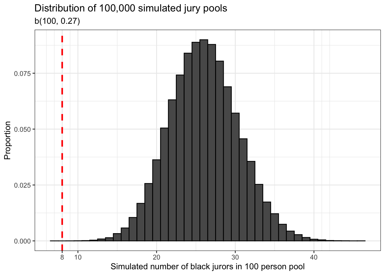 We have enough information about this case to do a couple of things. First, we can run a simulation that is based on it. Our simulation will focus on the composition of the jury pool. Second, we can use the results of our simulation to make an informed (but limited) judgment about the outcome of this Supreme Court case.