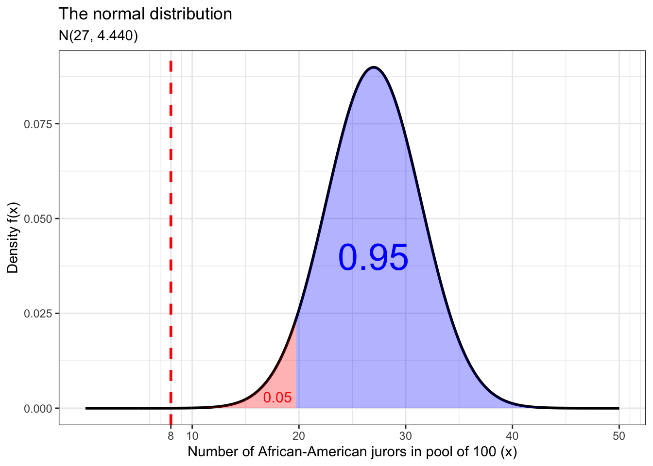 The first thing we should notice about our data is that it is normally distributed. This is something that should not surprise us given our knowledge of the central limit theorem. Second, we should notice the red dashed line that is drawn at x = 8. This represents the number of African-American jurors in the 100 person pool from which the jury which convicted Robert Swain was selected.