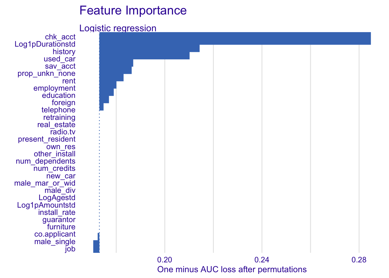 For the logistic regression, more variables have a positive variation on the mean prediction than in the random forest model. The variable chk_acct has the most negative change and influences the most the prediction. Besides chk_acct and prop_unkn_none, other variables have smaller effects on the mean prediction. It could be because they are not important for the prediction or because they effect are closer to the mean of the predictions for this specific instance.