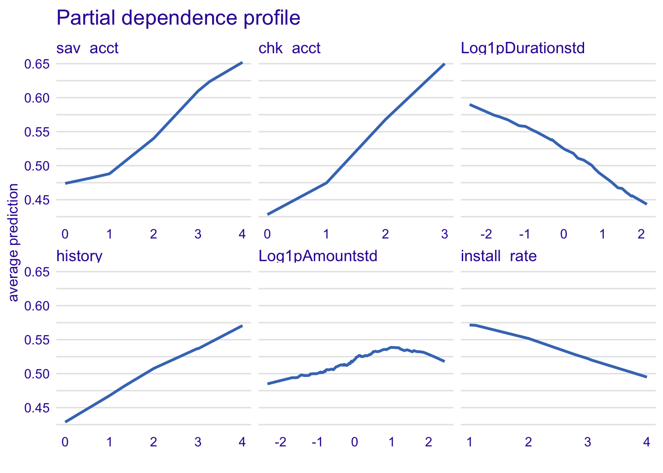 plot(model_profile_knn1, variables = c("sav_acct", "chk_acct", "Log1pDurationstd", "history", "Log1pAmountstd", "LogAgestd")) + ggtitle("Partial dependence profile ", "")