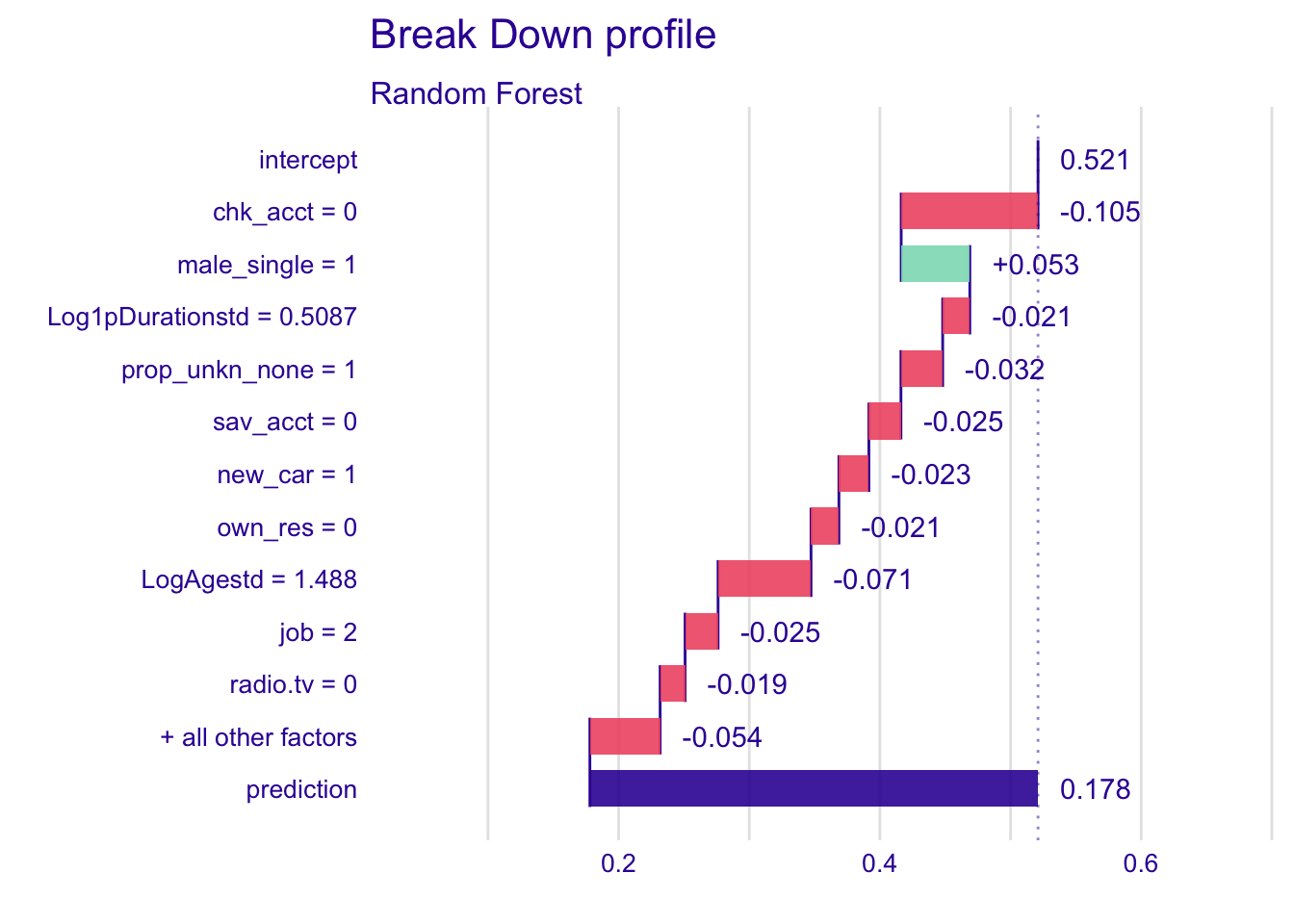 The break down profiles show the variations in the mean predictions. The plots are useful to assess the contribution of each variable to the prediction of the instance. Therefore, we look for changes in the predictions when values of variables are fixed.