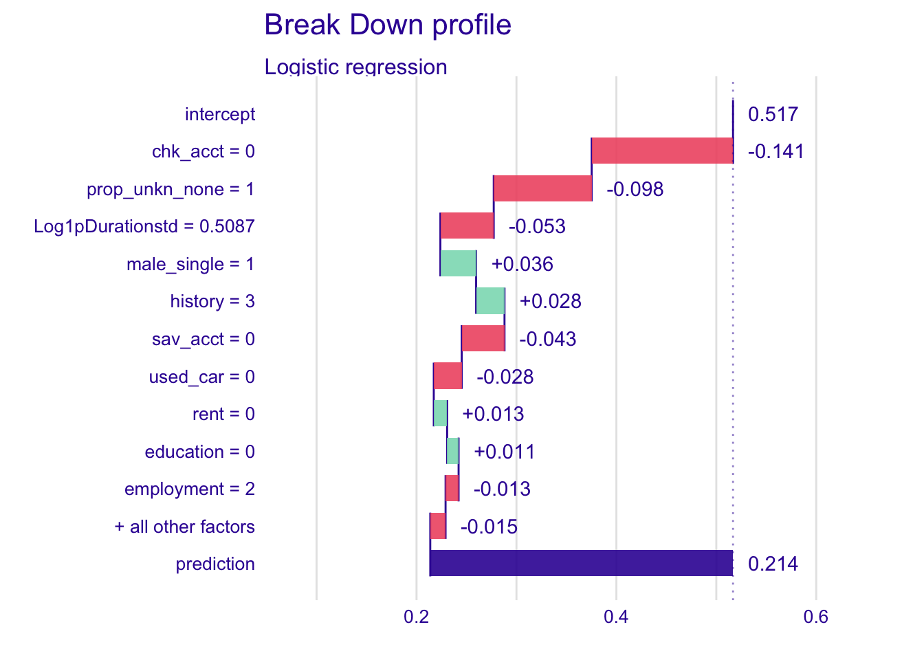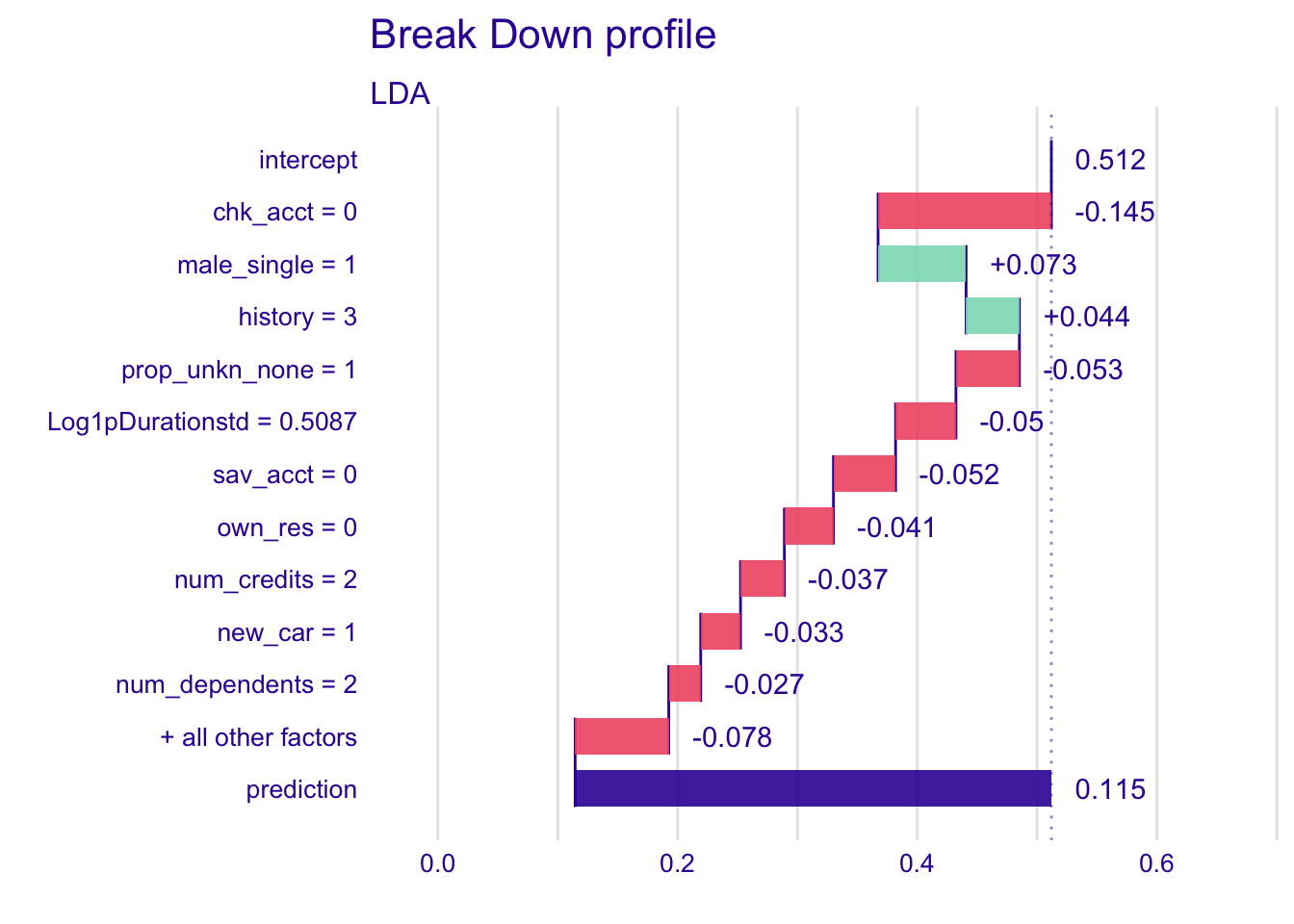 predict_profile_lda <- predict_profile(explainer_lda, new_observation = single_customer, variables = c("chk_acct", "Log1pDurationstd", "sav_acct", "history"))