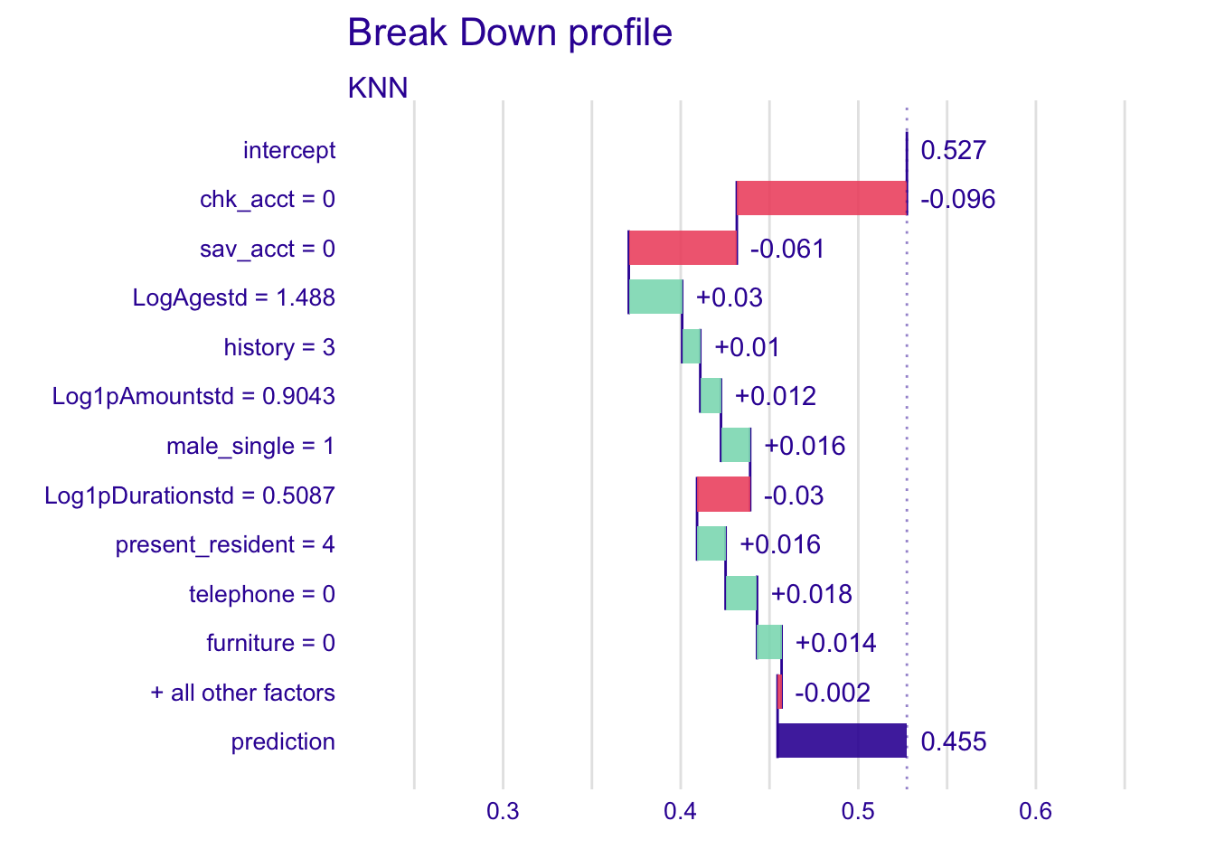 Only the variable male_single has a positive variation in the mean prediction, while others have a negative variation. Chk_acct is the explanatory variable that influences the most the prediction of the instance. By fixing the chk_acct value to 0, we reduce the mean prediction.