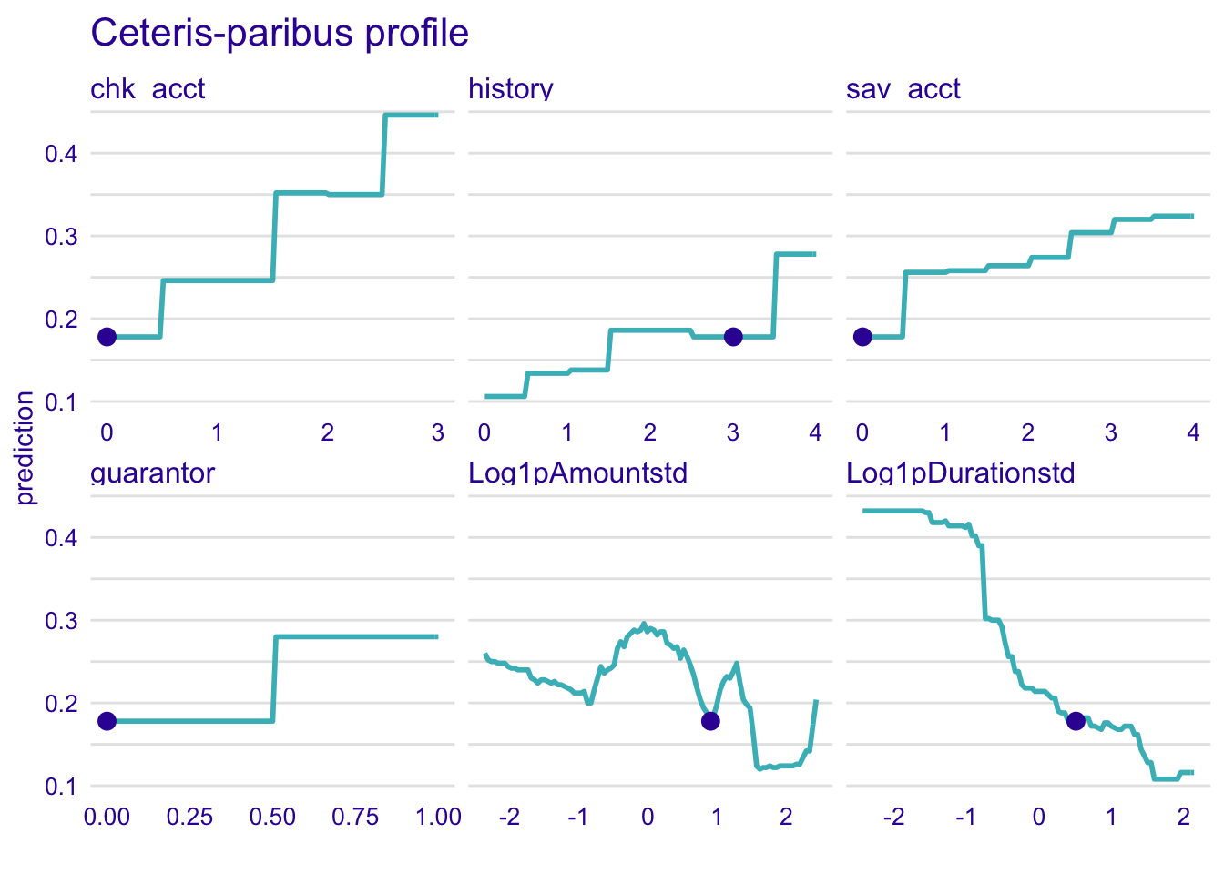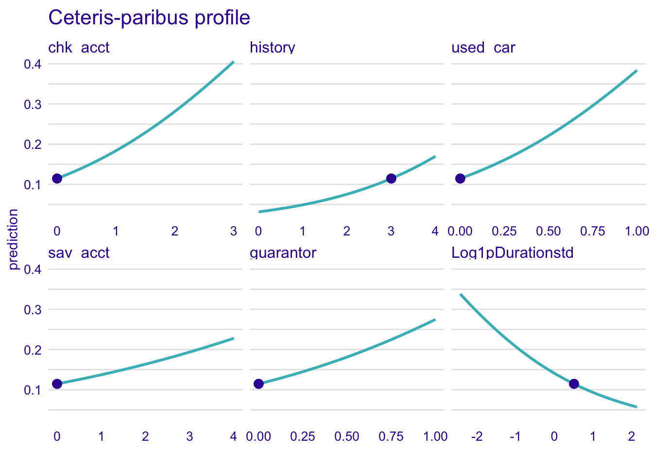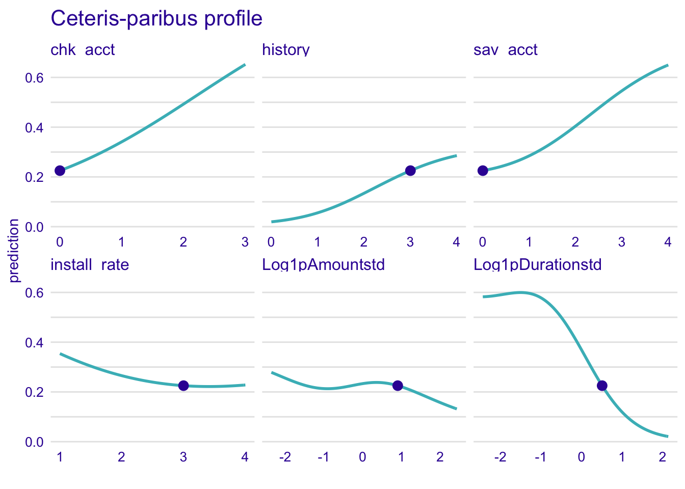 predict_profile_rf <- predict_profile(explainer_rf, new_observation = single_customer, variables = c("chk_acct", "Log1pDurationstd", "sav_acct", "history"))