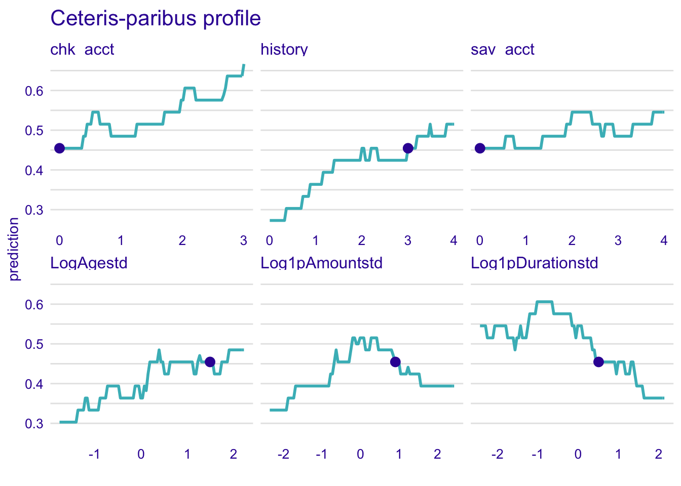 model_profile_knn1 <- model_profile(explainer_knn, type = "partial", variables = c("sav_acct", "chk_acct", "Log1pDurationstd", "history", "Log1pAmountstd", "LogAgestd"))