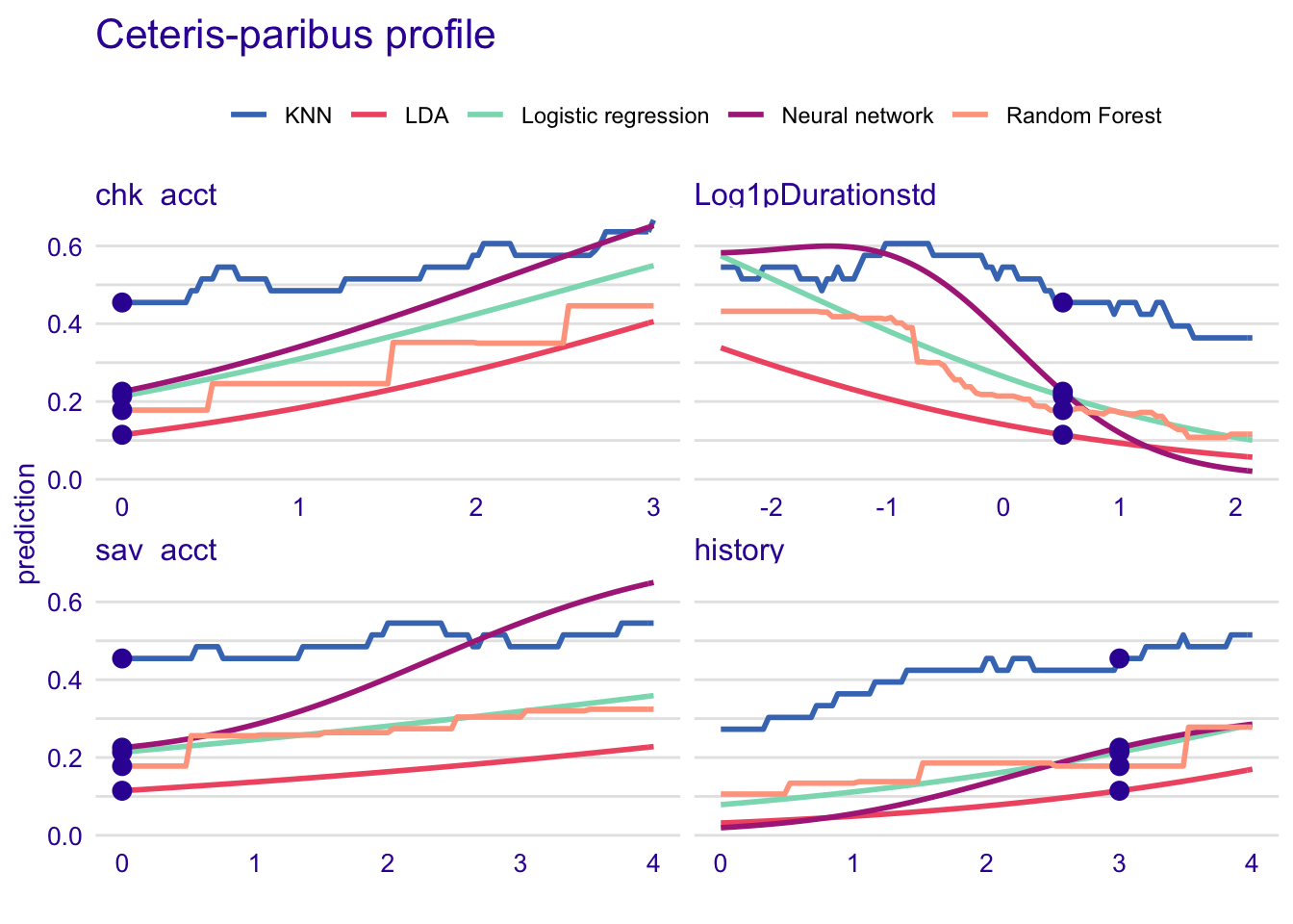 plot(predict_profile_rf, predict_profile_glm, predict_profile_knn, predict_profile_lda, predict_profile_nn, variables = c("chk_acct", "Log1pDurationstd", "sav_acct", "history")) + ggtitle("Ceteris-paribus profile", "")